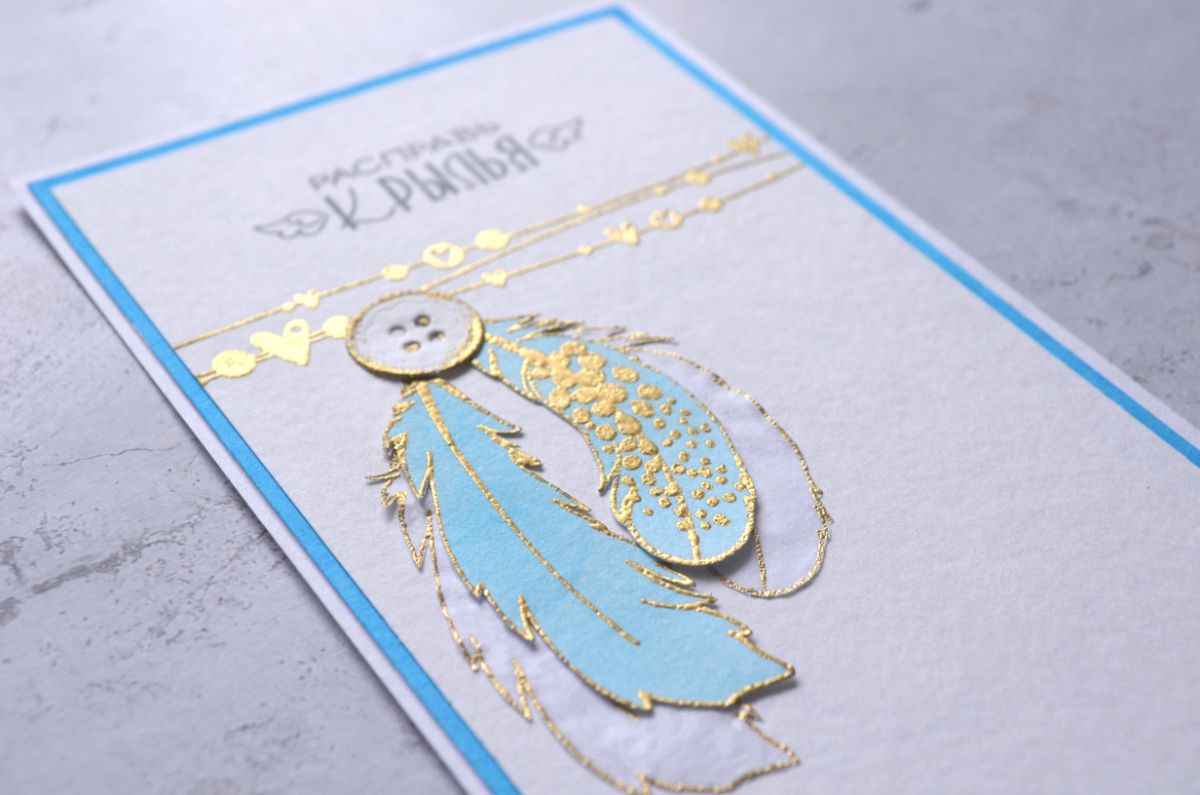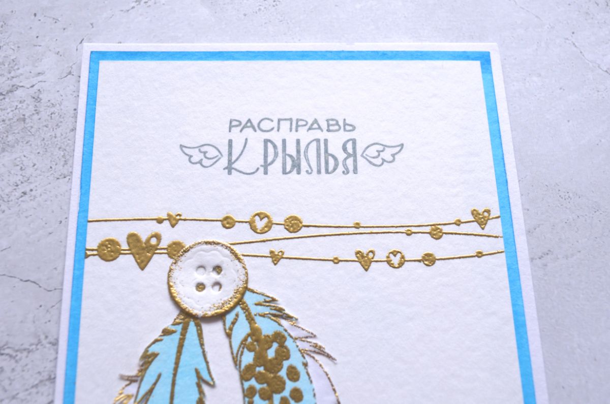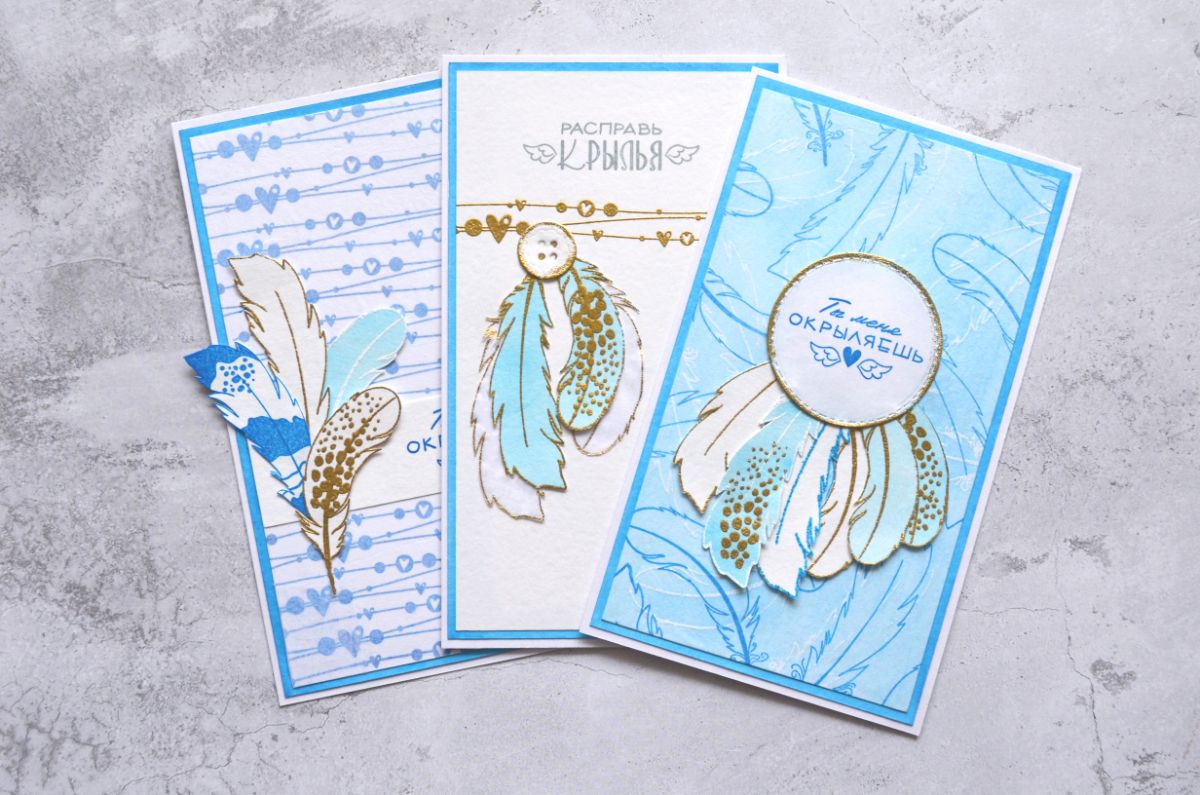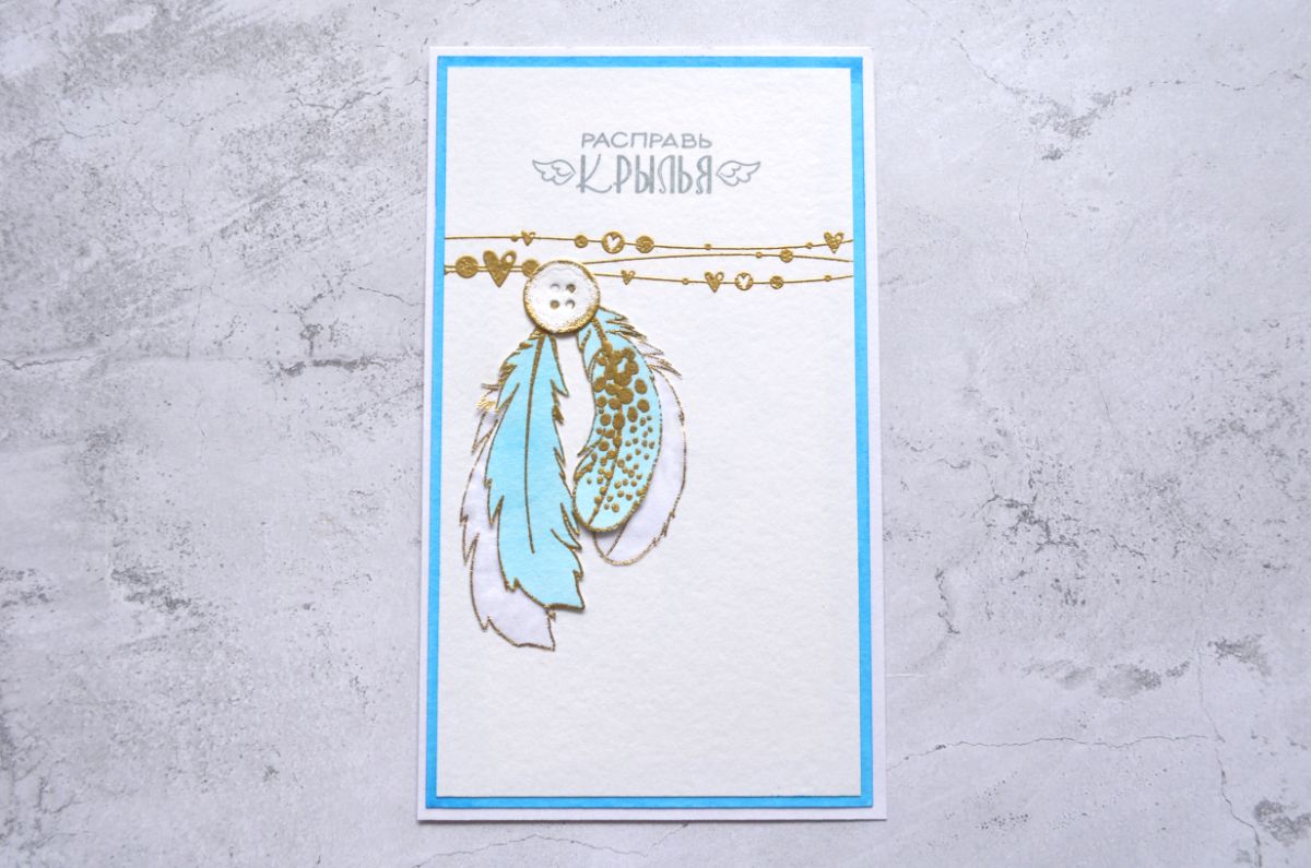 Чудесные надписи Ты меня окрыляешь и Расправь крылья стали оригинальными заголовками моих работ. А замечательные Перышко 1 и Перышко 2 оказались очень вариативными для применения в качестве декора, потому что каждое перышко можно не только сделать контурным, но и добавить штамповый рисунок внутри.