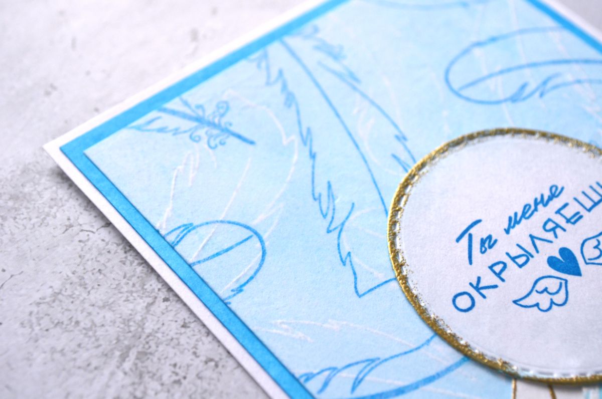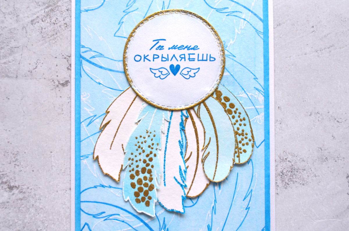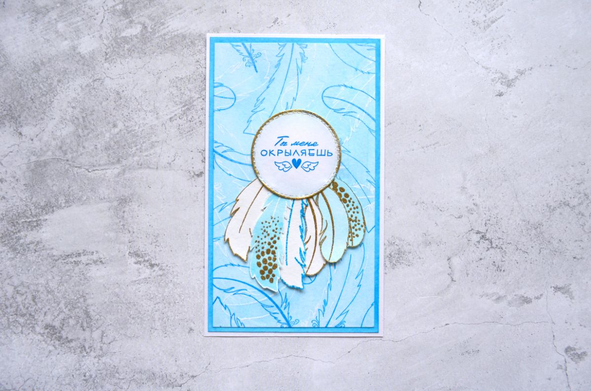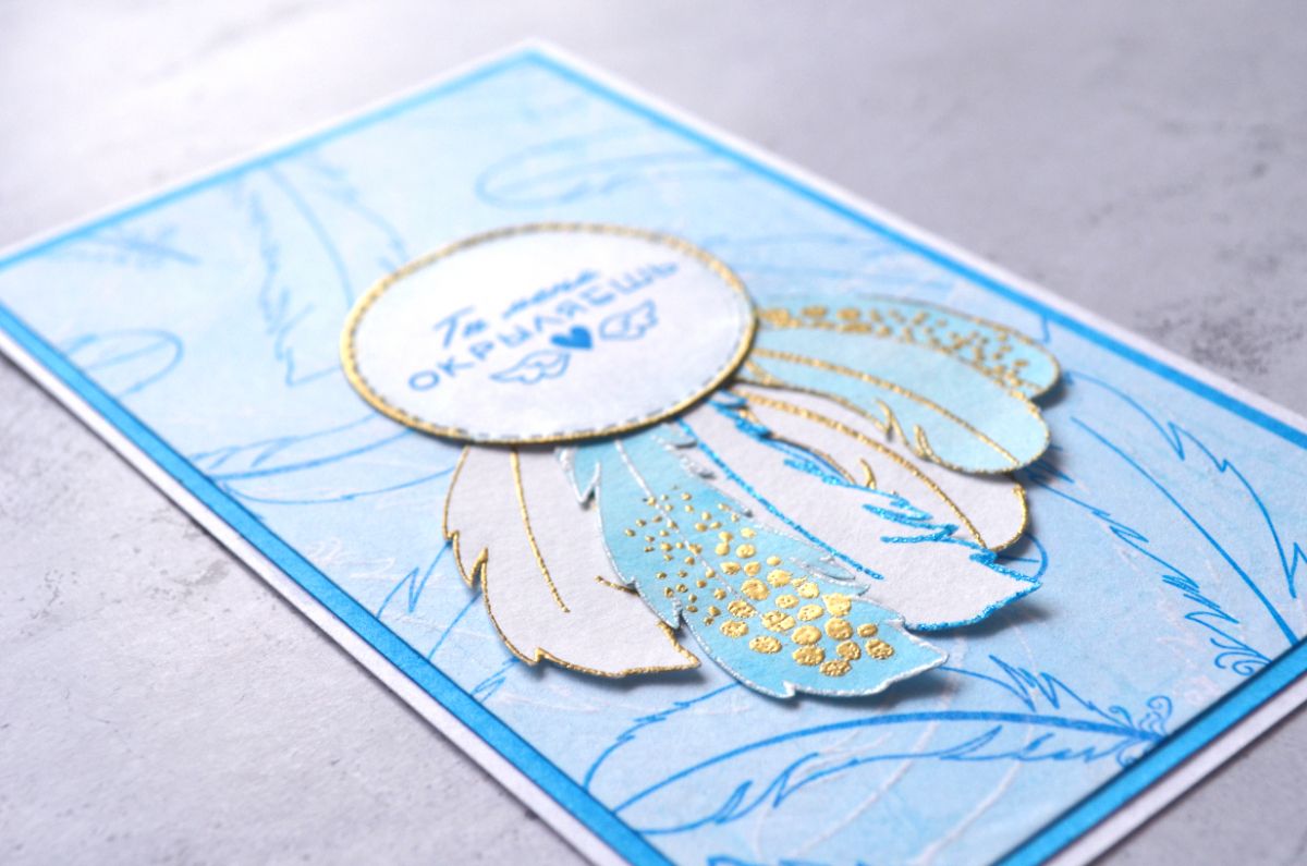 В этой работе сложносочиненный фон, который состоит из нескольких слоев. Нижний слой я окрасила в голубой цвет и использовала резист эффект для фоновых перьев с помощью белой пудры. Вторым слоем наклеила тишью с фоновым штампингом небесно голубыми чернилами. Таким образом получилось что эмбоссированные и чернильные оттиски наслаиваются друг на друга, а нижний фон стал приглушенным.