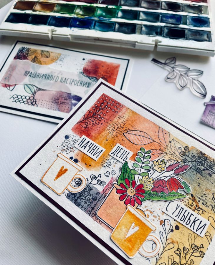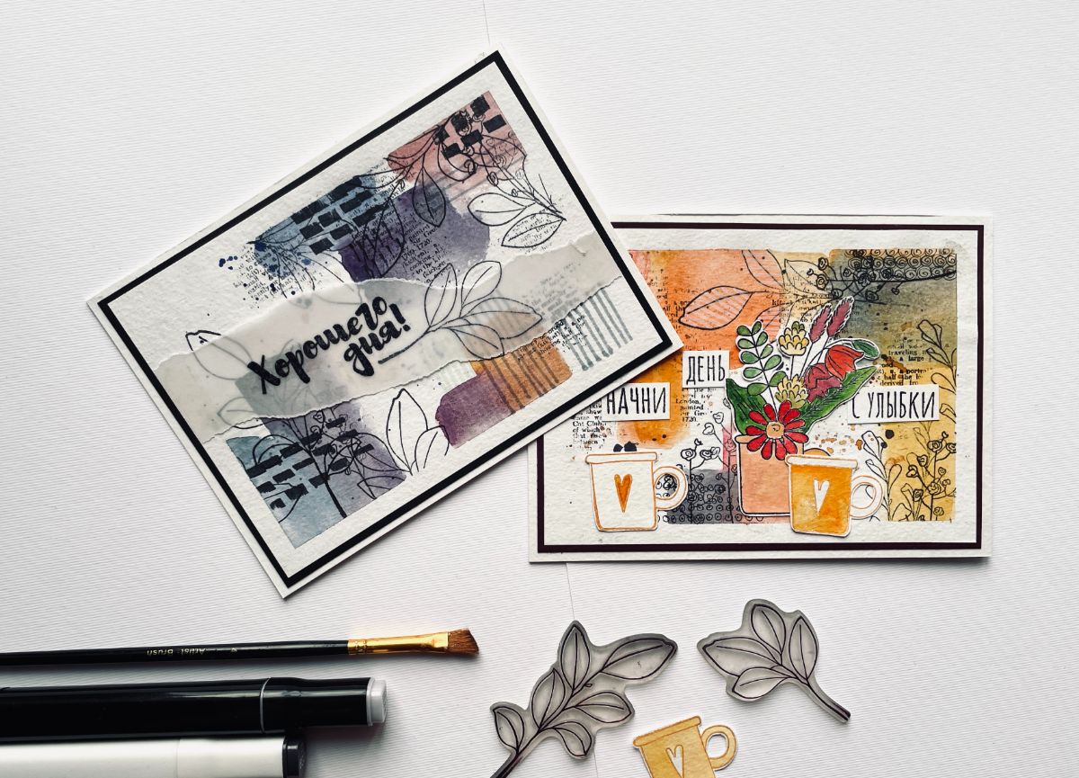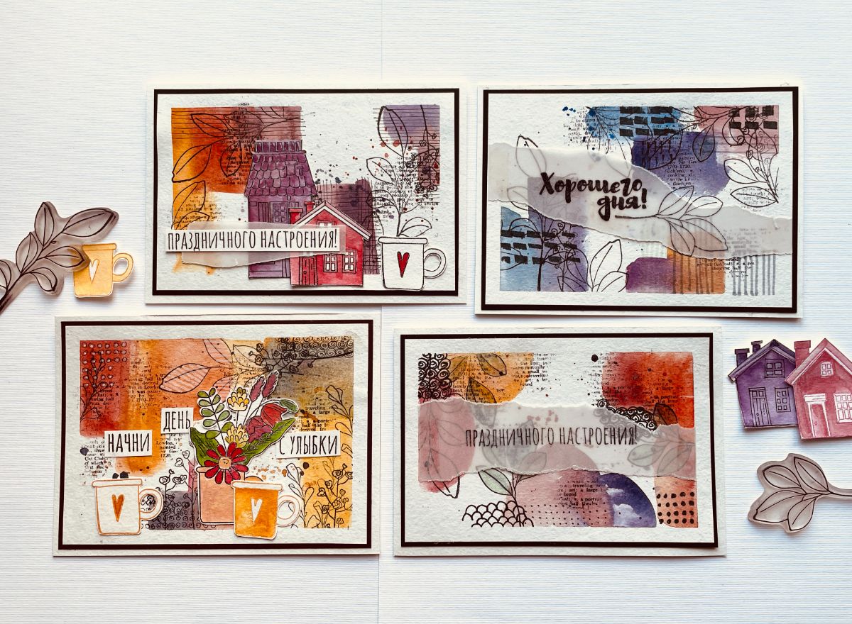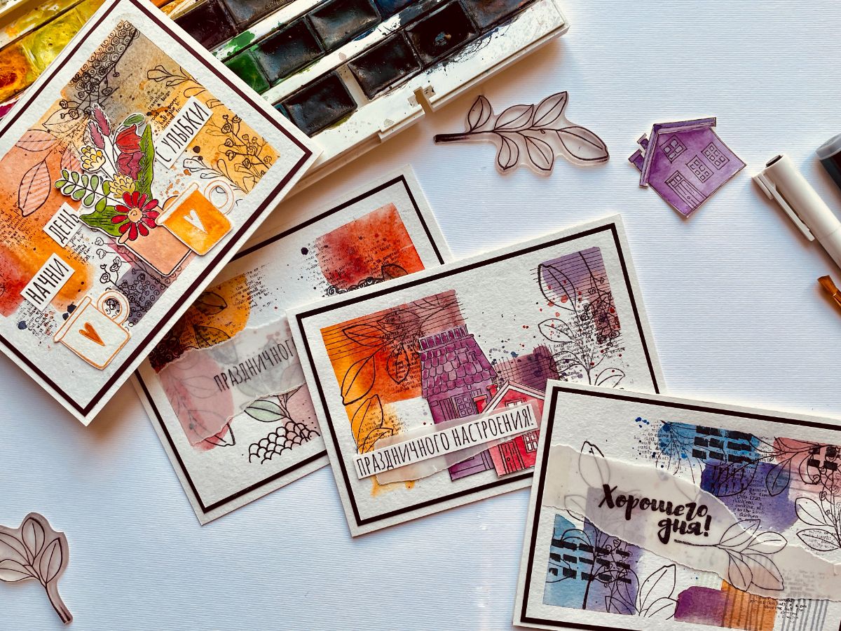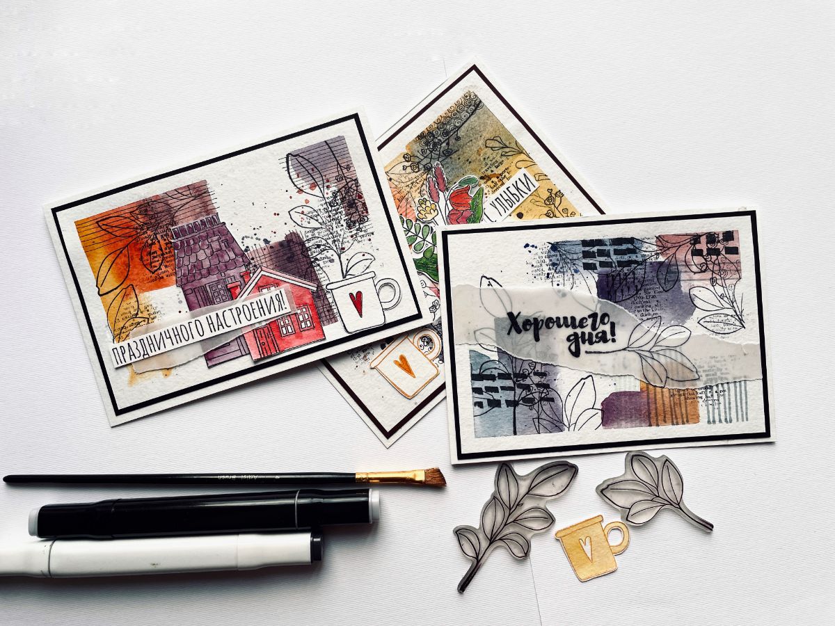Когда у вас с настроением не очень, или наоборот... очень даже хорошо, то самое время - пошалить)))) Но! У меня уже возраст такой, что шалости должны быть осознанные, т.е. творческие:) И, конечно, я решила заняться своим любимым занятием... с помощью акварели, штампов и нескольких маркеров создать фоны для открыток.