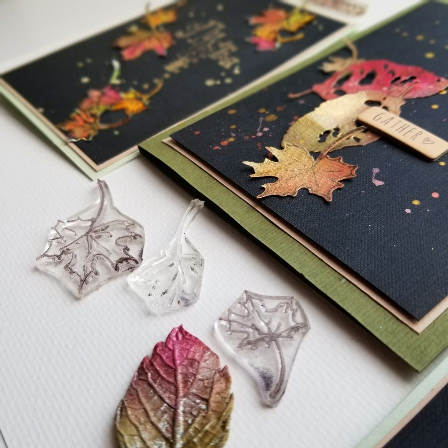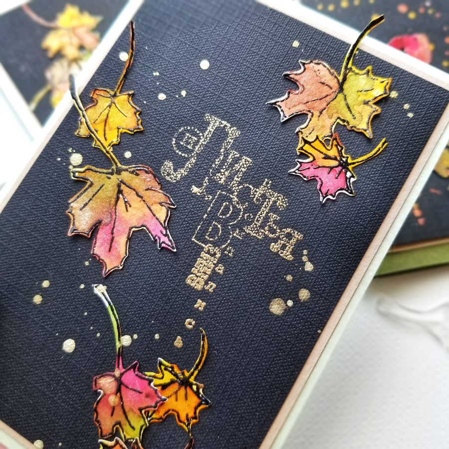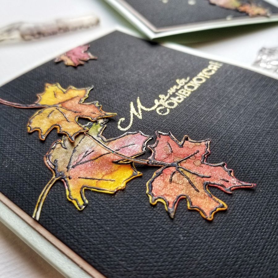 Яркие, по осеннему прекрасные листья, окрашенные спреями с перламутровым мерцанием, выгодно оттеняют свою красоту на черном фоне. И казалось бы черный, не совсем правильный фон для открыток. Но, согласитесь! Он совершенно не выглядит мрачным или унылым) Этакий добряк-толстячок, который держит в своих больших ладонях осень, подмигивая и заигрывая с ней))) Уж не знаю, откуда у меня вдруг такие ассоциации, но вот так работает творческая мысль.
