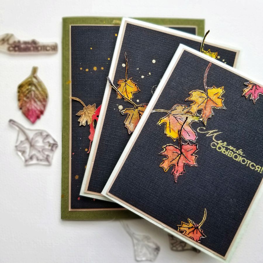 Завершающим штрихом у меня служат надписи Мечты Сбываются и Листья Посыпались вниз. А вы думали, что завершающий штрих это брызги?) Может быть и так, но вот открытка совсем без брызг и, на мой взгляд, она очень самодостаточна. Как вы считаете?