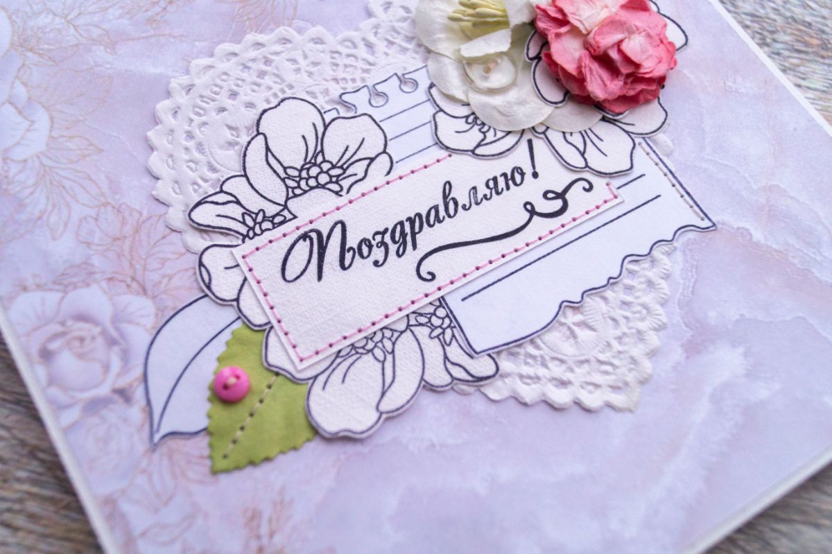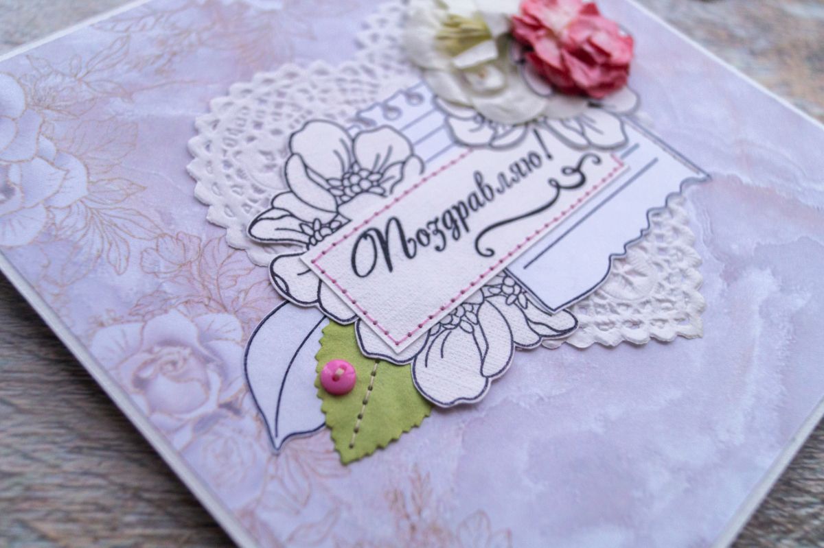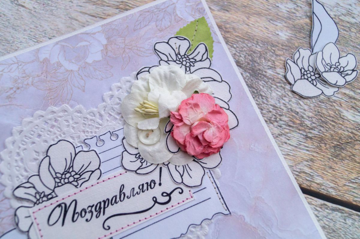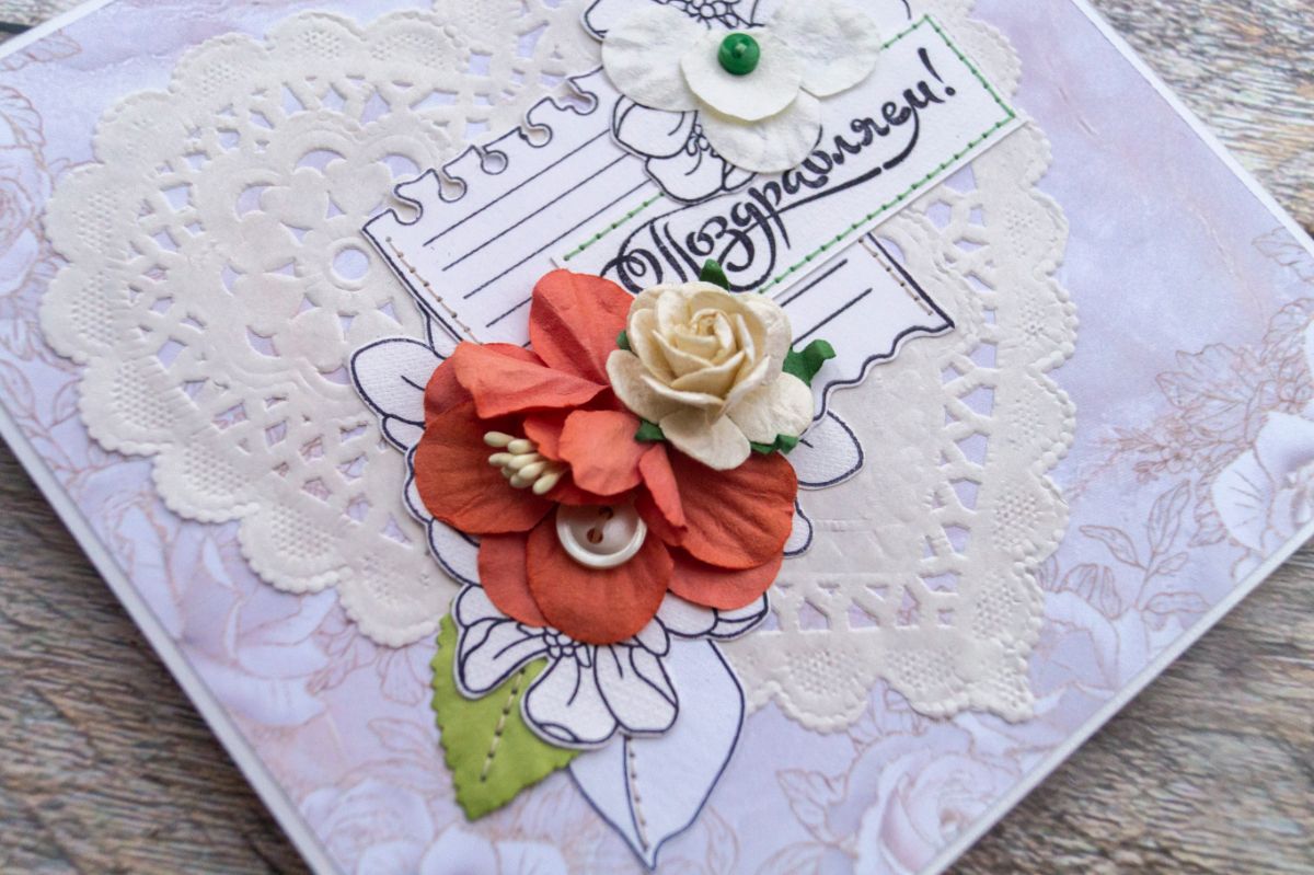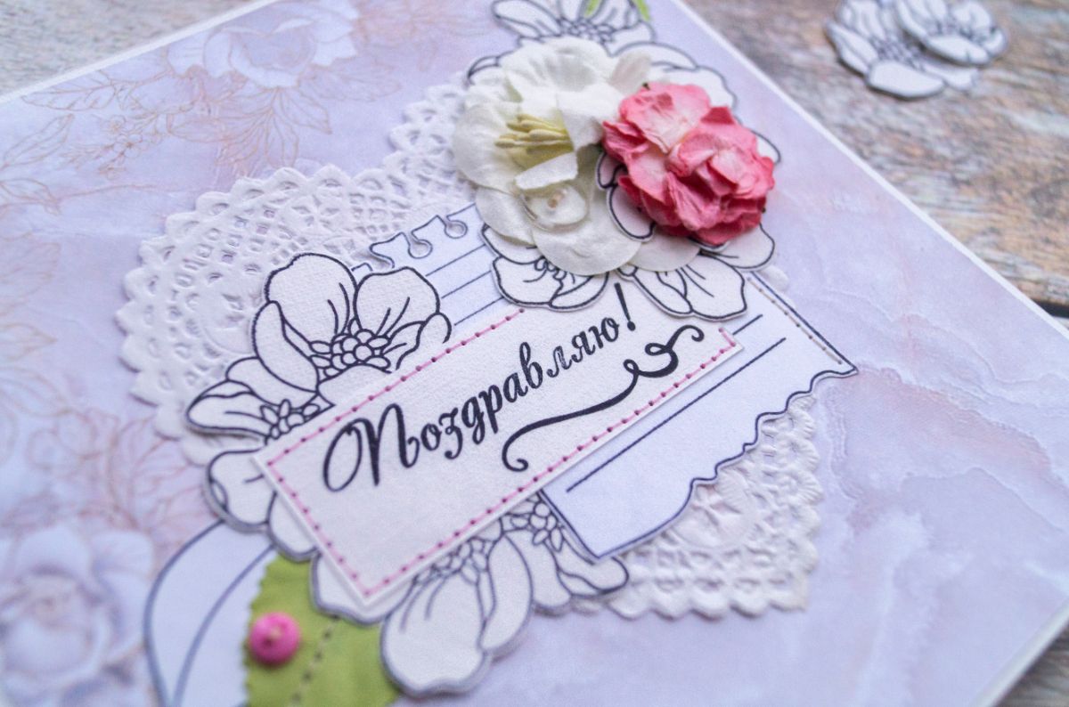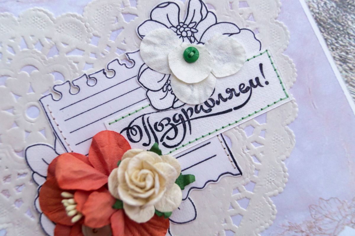 Давненько я не делала классических поздравительных открыток. В этот раз решила использовать многими подзабытые салфеточки и бумажные цветы из старых запасов. И, конечно же, как без штампинга здесь обойтись. Изначально были мысли разукрасить отштамповки, но в итоге отказалась от этой идеи, ибо показалось, что это было бы перебором, а хотелось какой-то лёгкости и нежности с яркими акцентами в виде пуговок, швейной строчки и бумажных цветов с листьями.
