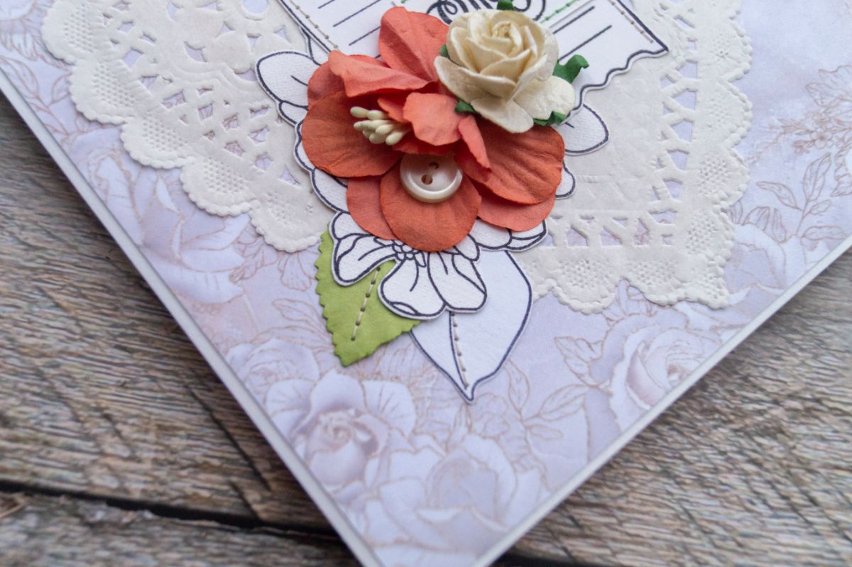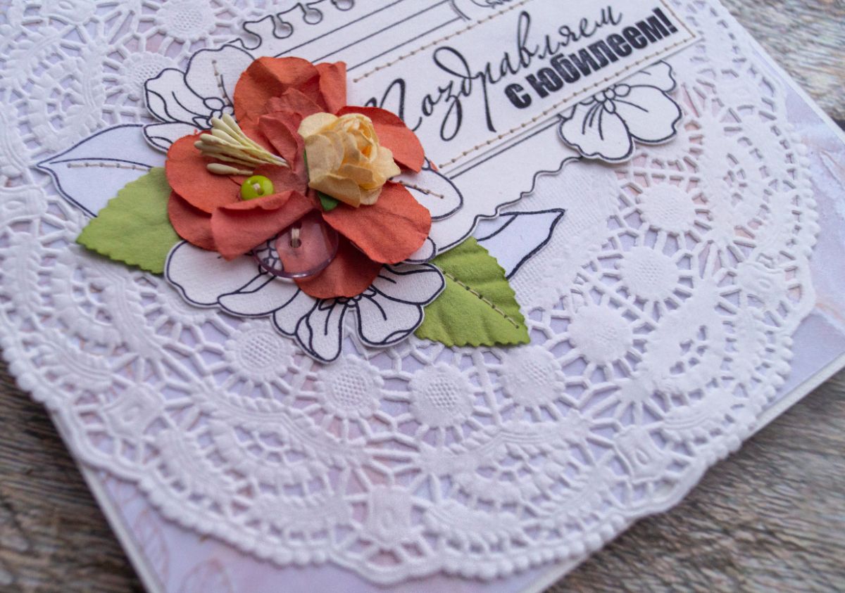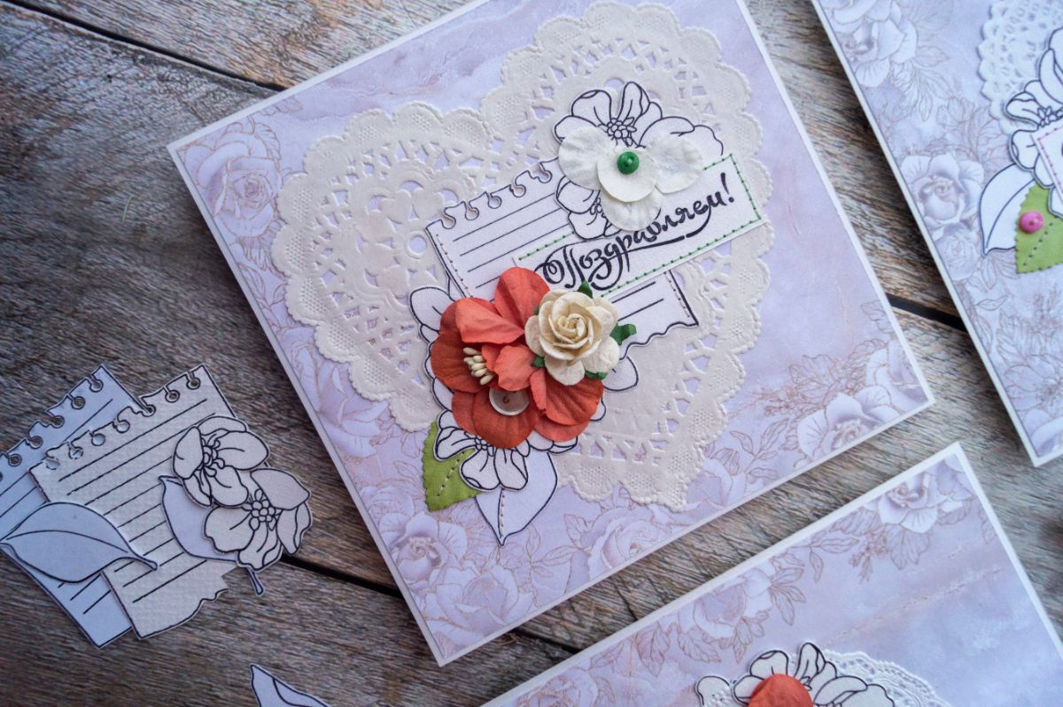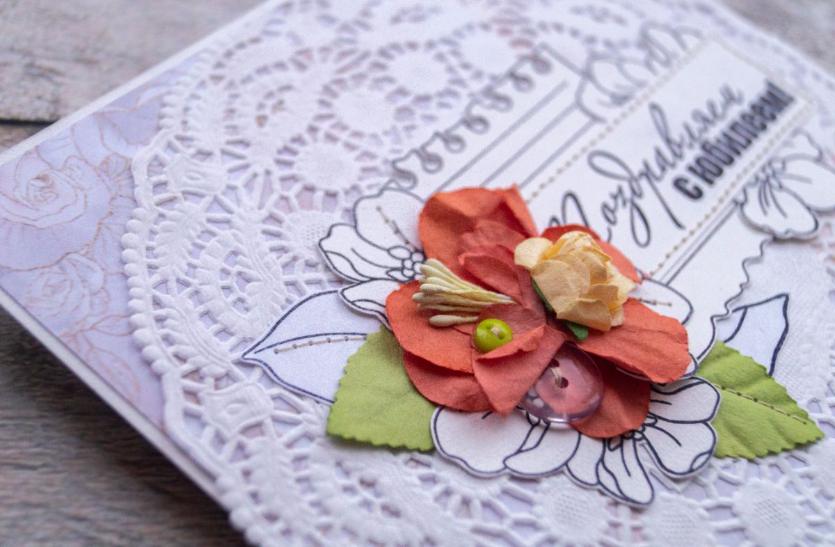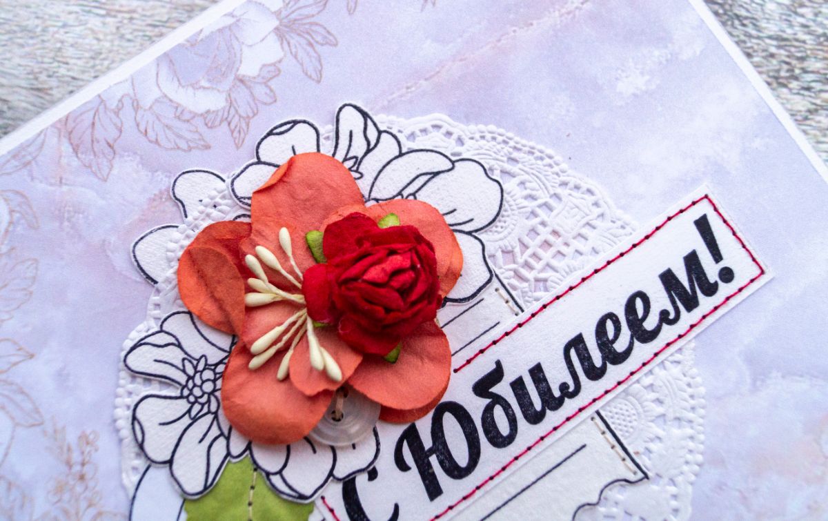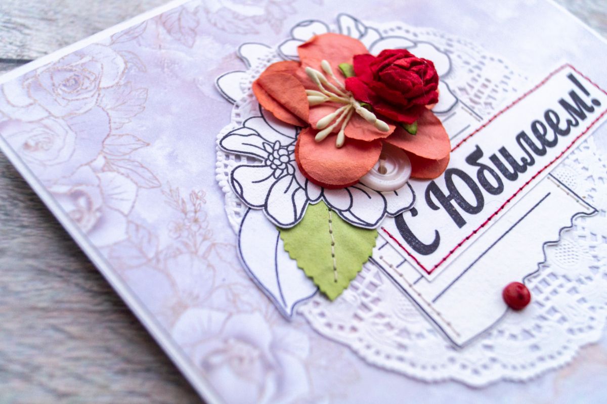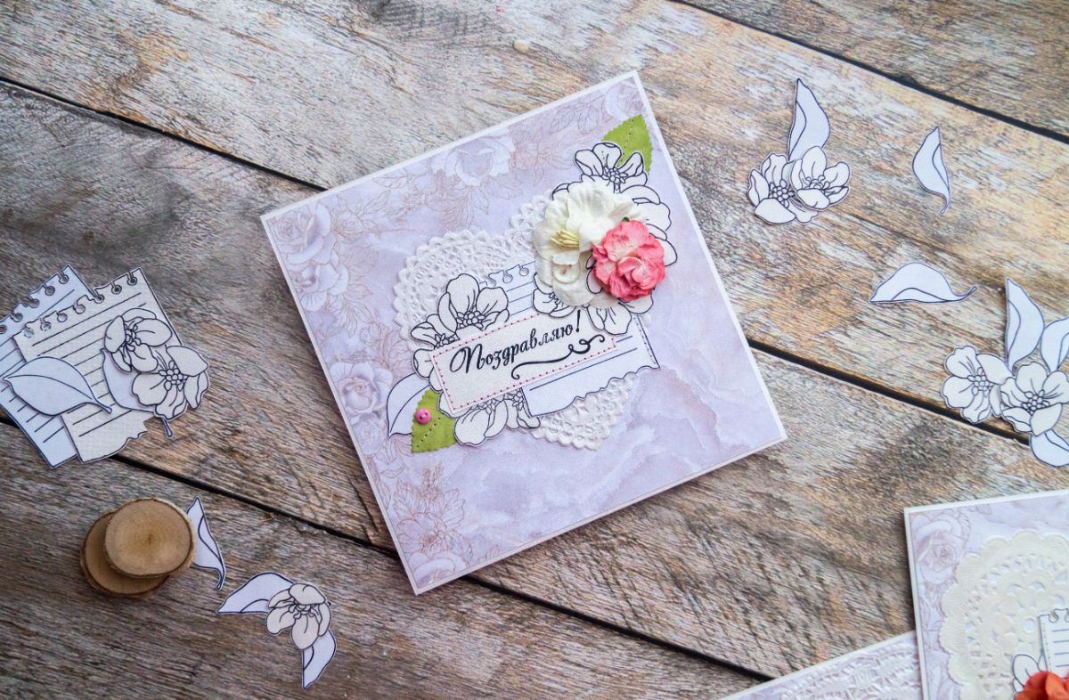 Давненько я не делала классических поздравительных открыток. В этот раз решила использовать многими подзабытые салфеточки и бумажные цветы из старых запасов. И, конечно же, как без штампинга здесь обойтись. Изначально были мысли разукрасить отштамповки, но в итоге отказалась от этой идеи, ибо показалось, что это было бы перебором, а хотелось какой-то лёгкости и нежности с яркими акцентами в виде пуговок, швейной строчки и бумажных цветов с листьями.