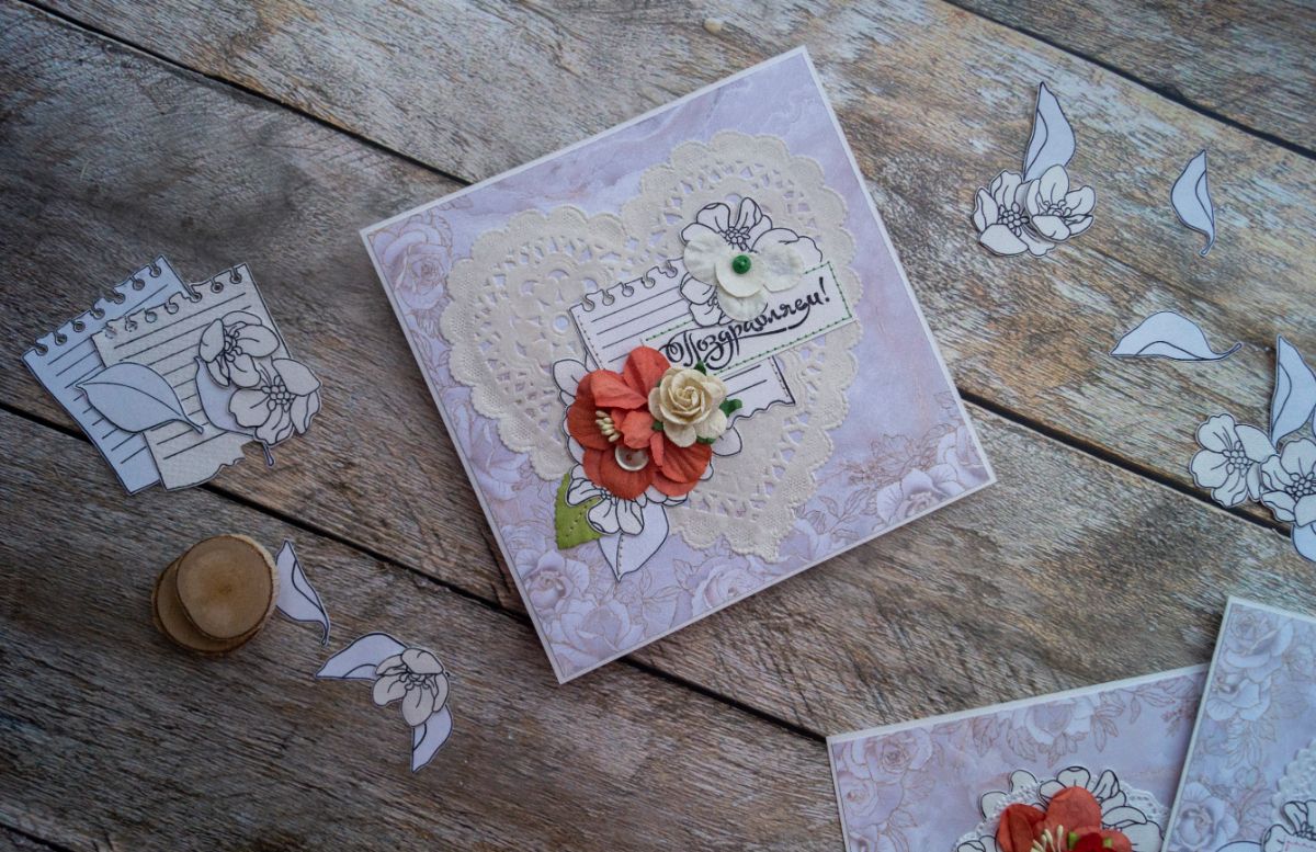 Вот такие получились 4 открытки форматом 15 х 15 см, на которые ушёл один фоновый лист скрапбумаги 30 х 30 см. Желаю всем творческого вдохновения и больше поводов делать и дарить открытки!