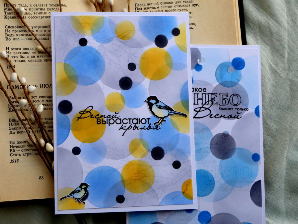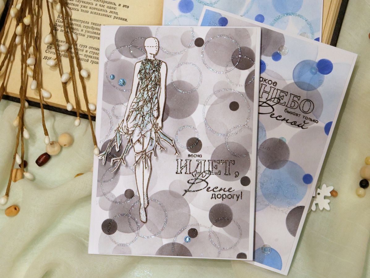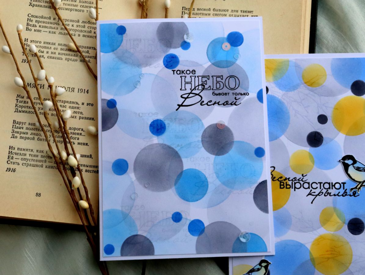 За окном все еще зима, хотя на календаре март… Мне захотелось сделать даже не открытки, скорее зарисовки вот этих предвесенних дней, когда едва уловимые знаки весны уже чувствуешь в воздухе, а небо становится совершенно особенным. И фон захотелось сделать особенный - легкий, воздушный и немного мерцающий.
