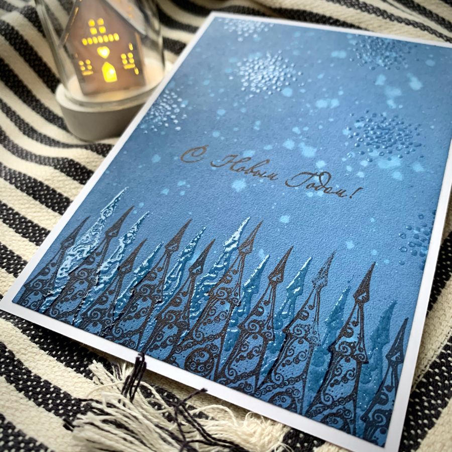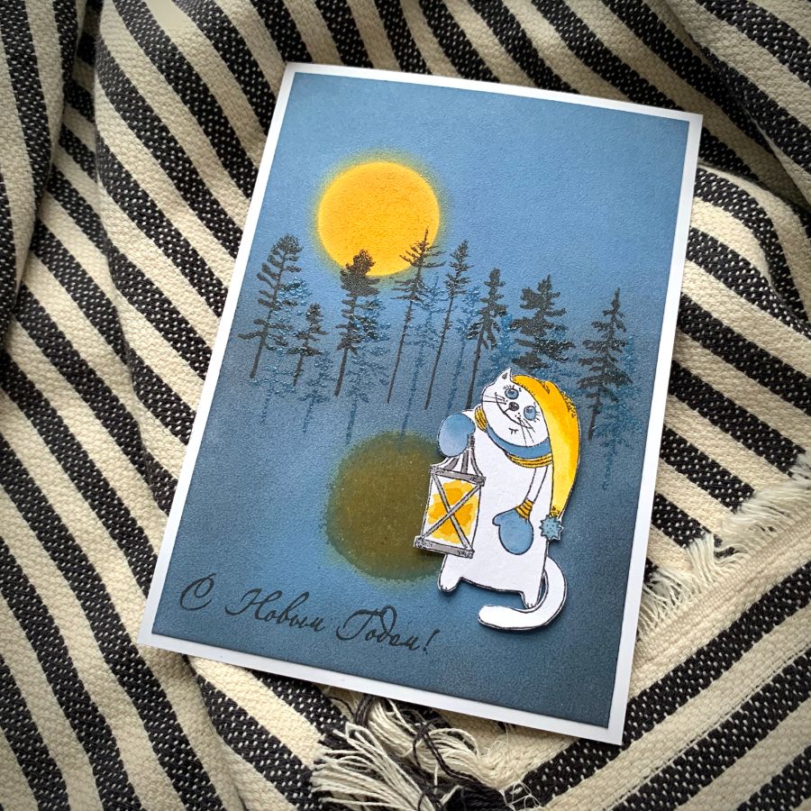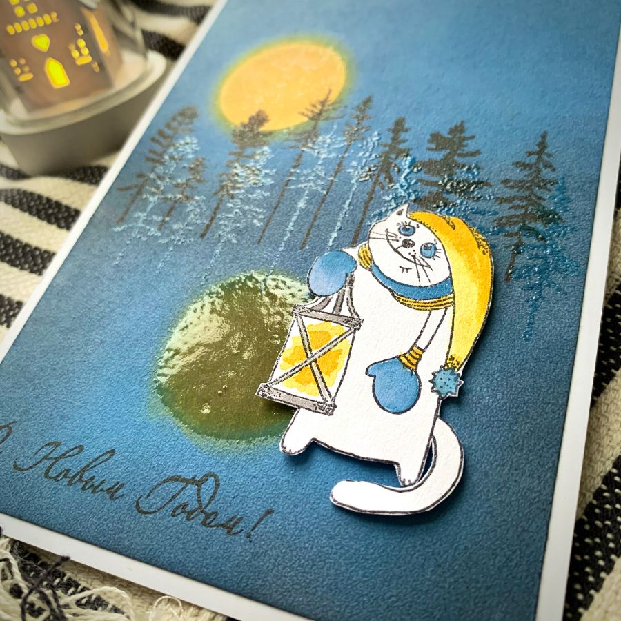 В эти открытки я поселила трёх котиков и уже знакомые нам елки. Фоны сделала при помощи distress oxidе. Штамповала чёрными архивными чернилами, раскрашивала тоже дистрессами и ещё добавила немного блеска при помощи эмбоссинга. Прозрачная пудра здесь украшает штампы и трафаретные оттиски.