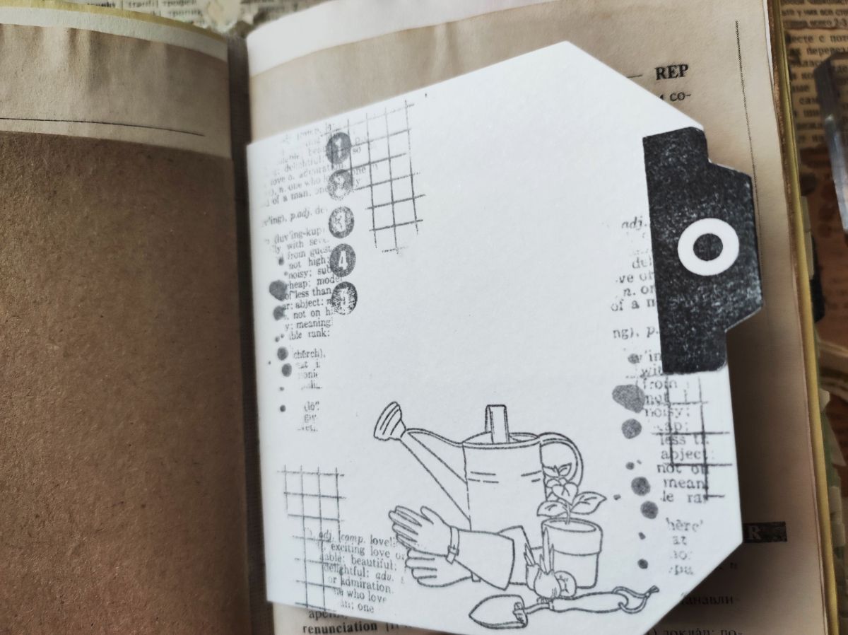 В дачном блокноте хорошо смотрятся закладочные ярлыки, на них можно отштамповать надписи в стиле проджект-лайф: Работа в саду, Посадка, Полив, Удобрение, Обрезка. А можно на них собрать композицию из штампов. Маленькие тежики тоже хороши в качестве декора на разделителях. Их также можно украсить штампами.