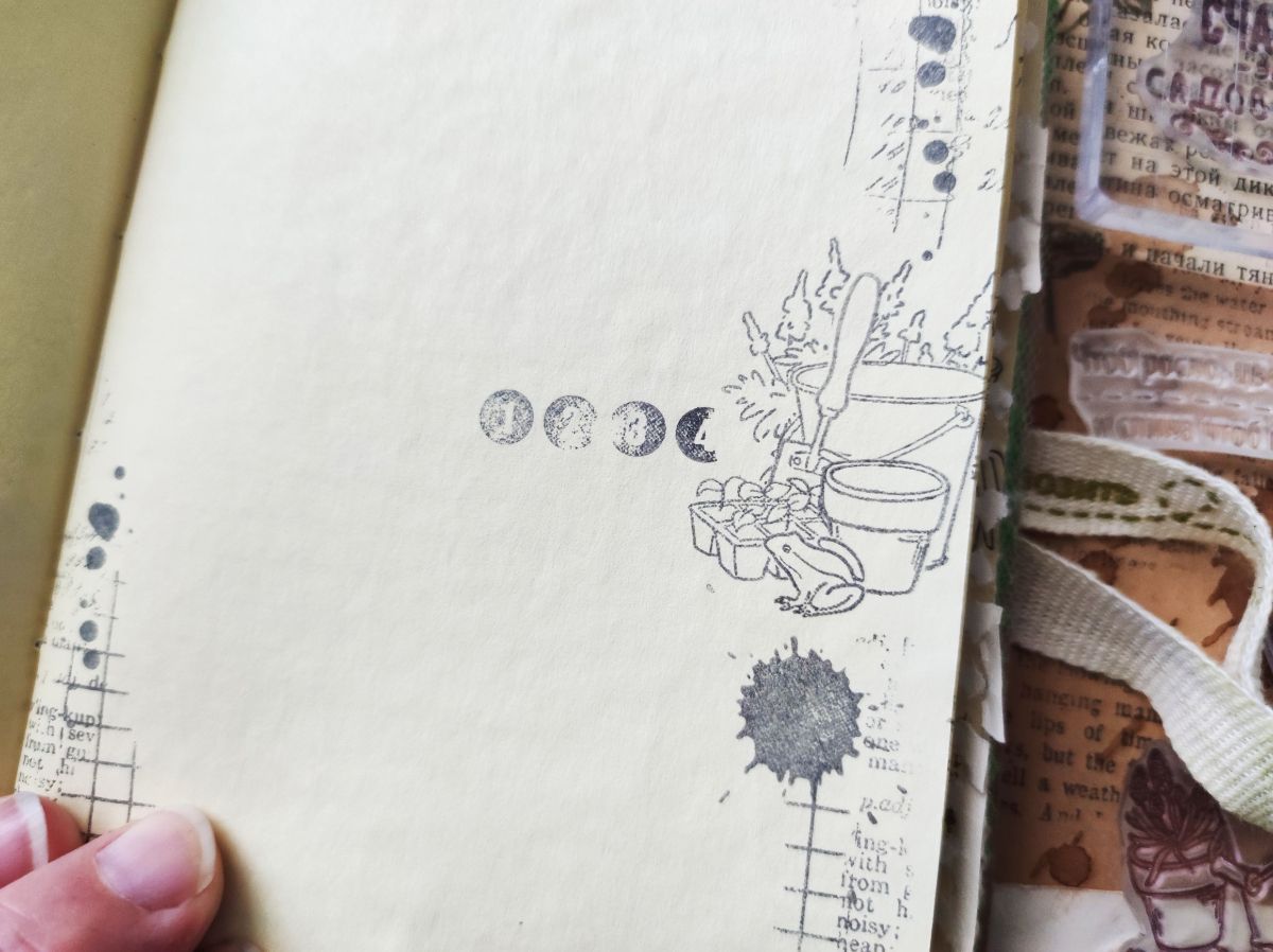 Поскольку этот блокнот в частности для записи дачных наблюдений, я добавила кое-где разлиновку штампом Журналинг, а в качестве декора на страничках фоновые штампы Фон-Клеточка, Календарь 1916, Словарик, Метраж, и в качестве акцентов Набор цифр8 горизонтальный и вертикальный.