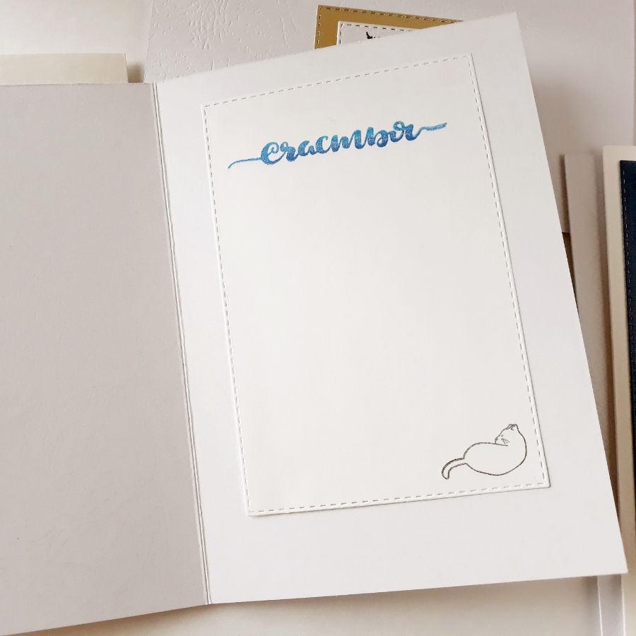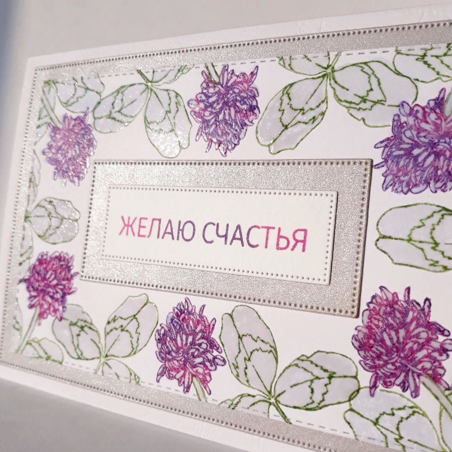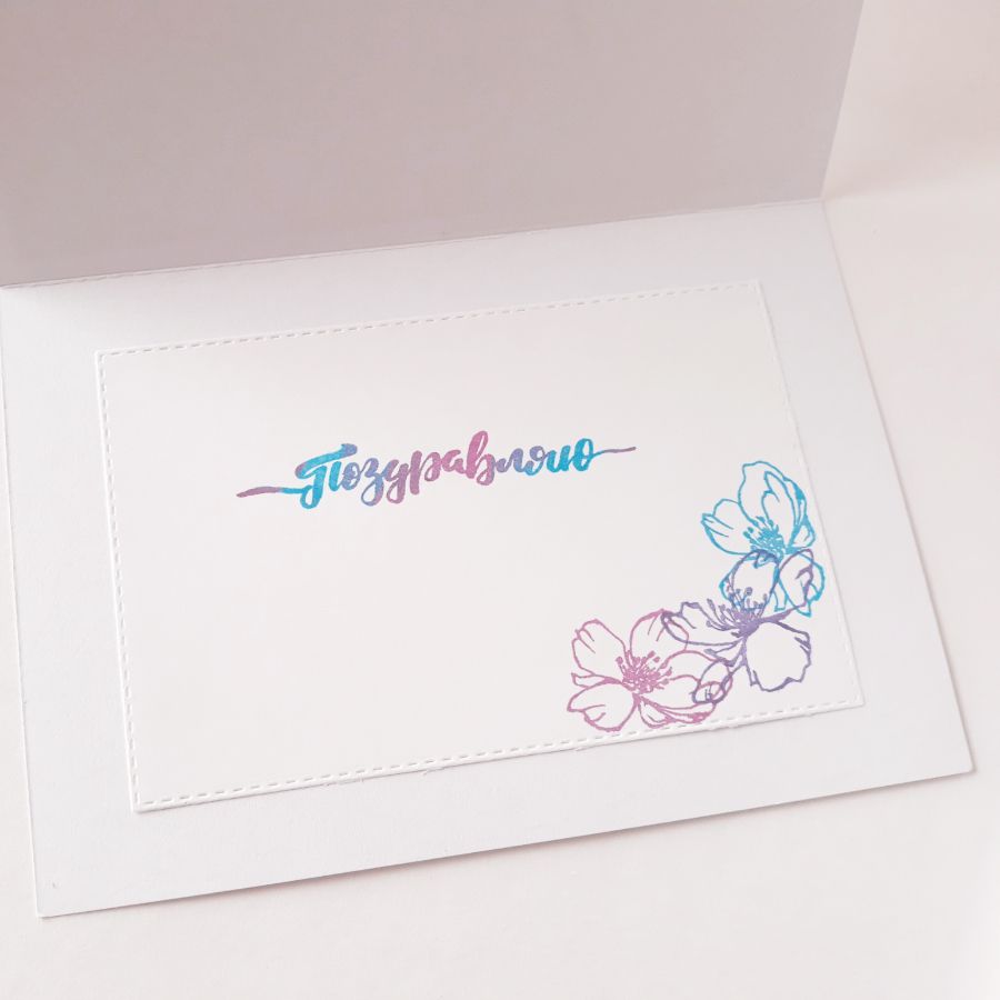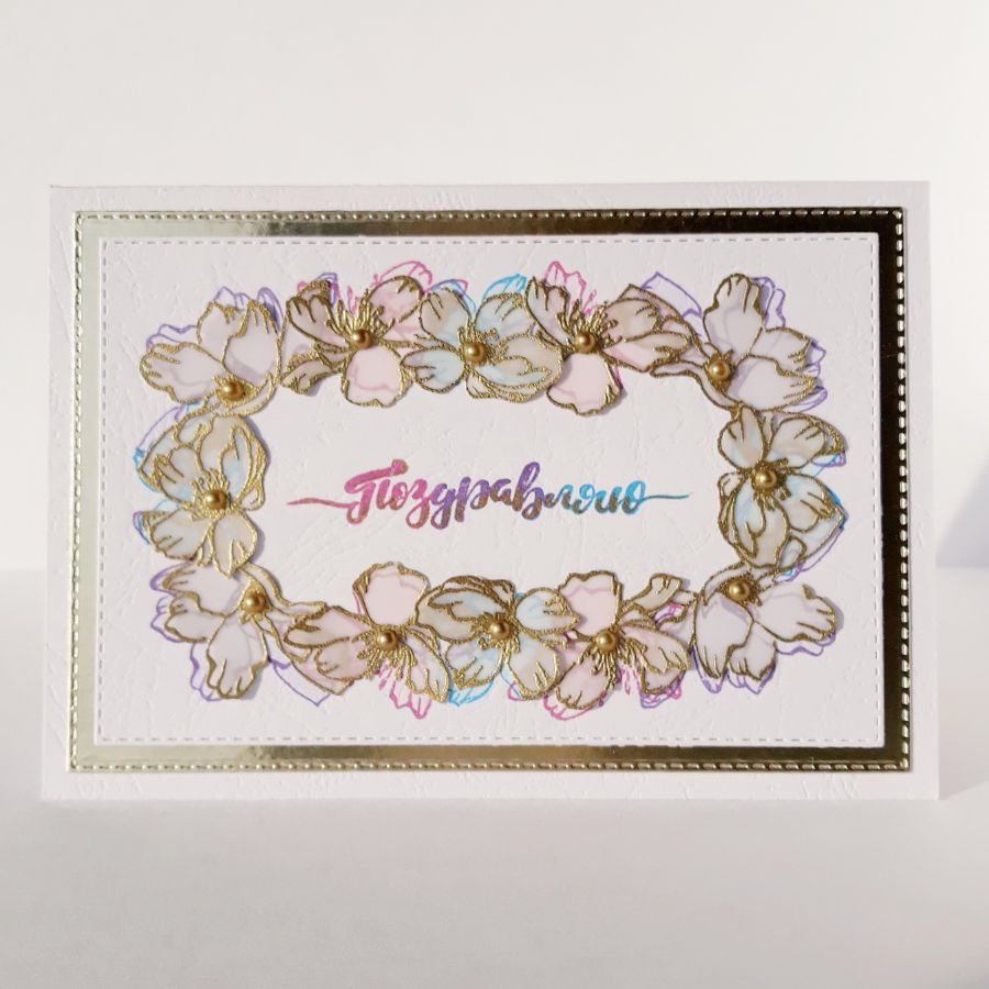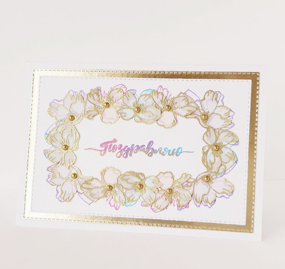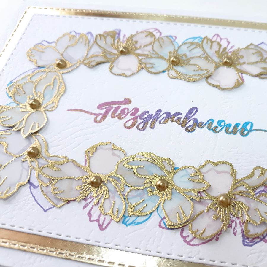 Торжественно-воздушная композиция в этой открытке напоминает предыдущую с той лишь разницей, что рамка для поздравительной надписи не расположена четко по контуру края, а непринужденно обрамляет ее внутри. Оттиски для объемного слоя из полупрозрачной кальки, украшенные золотыми полужемчужинами, сделаны с помощью детализированной золотой пудры для эмбоссинга и вырезаны по краю без отступа за контур. Чтобы придать им цвет, на подложке поставлены оттиски чернилами трех цветов без использования масок (контур на контур), и раскрашены спиртовыми маркерами в тон так, чтобы нижний цветной слой лишь слегка угадывался под прозрачностью первого. При этом верхний слой цветков расположен с небольшим смещением, чтобы рамка с достаточно плоским декором выглядела воздушно, объемно и красочно.