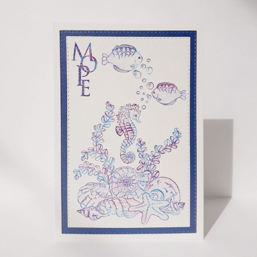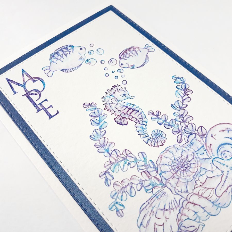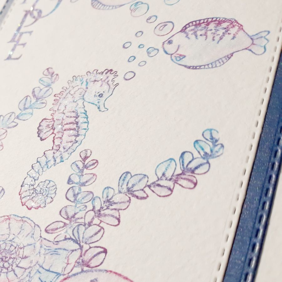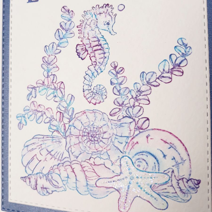 В этой композиции - приемы из урока для Школы Штампинга "Радужный штампинг 2". Мне захотелось сделать не просто картинку на морскую тему, а передать ощущение чистоты и прозрачности солёной воды, причудливые формы и безмятежность многочисленных обитателей рифа. Поэтому оттиски поставлены чернилами двух цветов и размыты. При этом слегка окрашенная чернилами вода с кисти частично переносилась на свободные от линий внутренние места оттисков, а не только размывала область по краю контура. Кроме того, я добавила на некоторые изображения акценты с помощью прозрачного голографического клея с глиттером и прозрачных чернил с лёгким блеском - "шиммер".