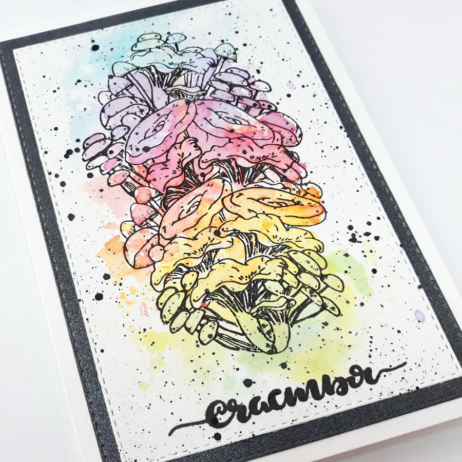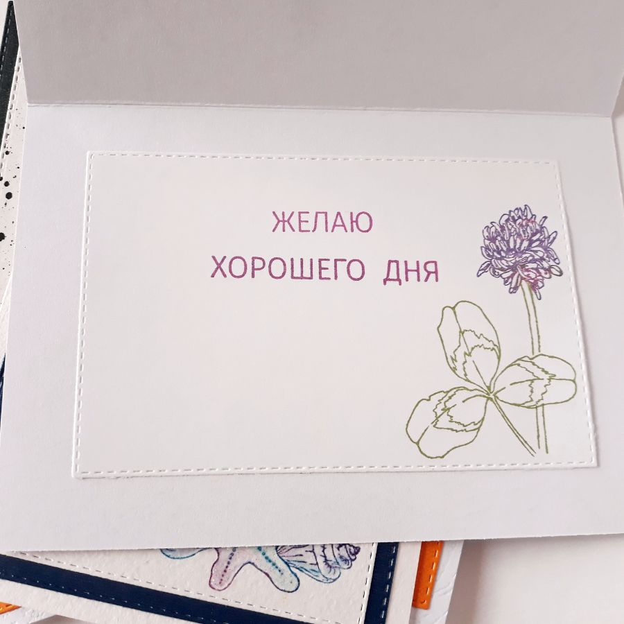 В открытке с рамочной композицией ощущение спокойной доброжелательности создано с помощью многоцветных оттисков. Приём хорошо знаком ученикам Школы Штампинга, где я подробно описала эту технику в уроке "Радужный штампинг". Чтобы придать открытке более праздничный вид, я воспользовалась прозрачной пудрой и маркером для эмбоссинга. Поскольку прозрачная пудра имеет легкий оттенок, "эмаль" на цветках и листьях помогает не только добавить блеска, но и визуально выделить детали на белом фоне, сделать чернила более яркими, а переходы цвета в цвет - более плавными.