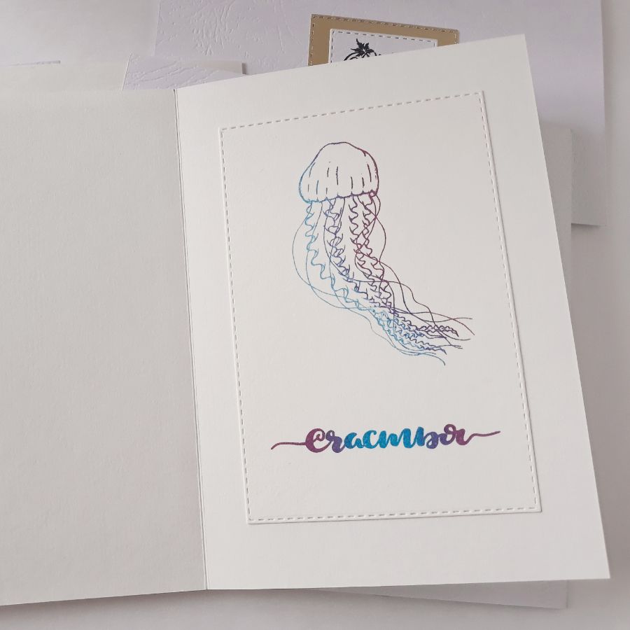 Вторая часть надписи расположена внутри открытки, где находится оттиск медузы с тем же приемом, но без размытия. ...Море счастья, Море гармонии или, как в знаменитом фильме с Аль Пачино, Море любви...
