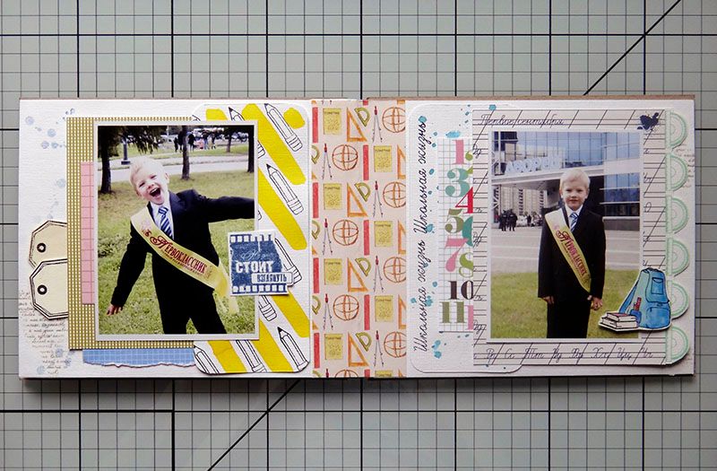 На втором развороте фотография с линейки, где в кадр попала учительница и единственный кадр из класса в этот день. Миша оказался на последней парте, но был очень весел, в отличии от мальчика, сидящего перед ним. В качестве фонового штампа использовала квадрат из набора «Моя семья».