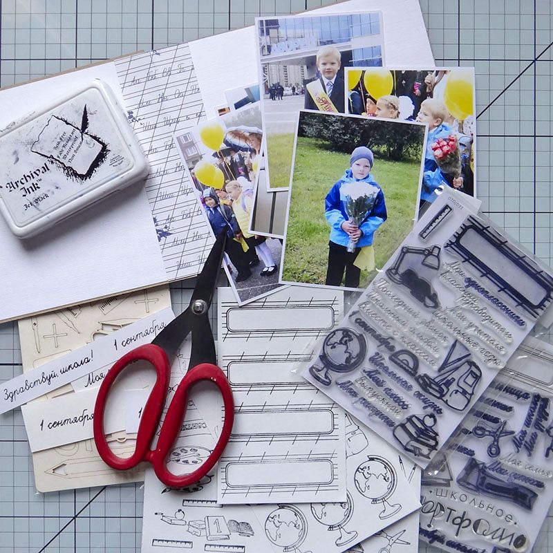 С помощью штампов я украсила странички для альбома. К школьным наборам добавила «Лист в квадрате 3».