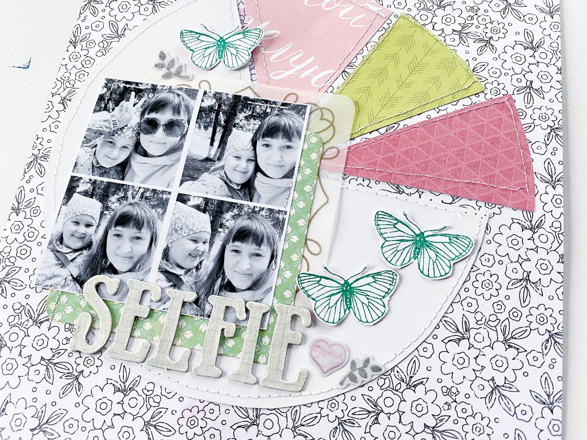 Эту страничку сделала почти в монохроме, но в итоге добавила немного цвета из украшения только Бабочки и немного наклеек
