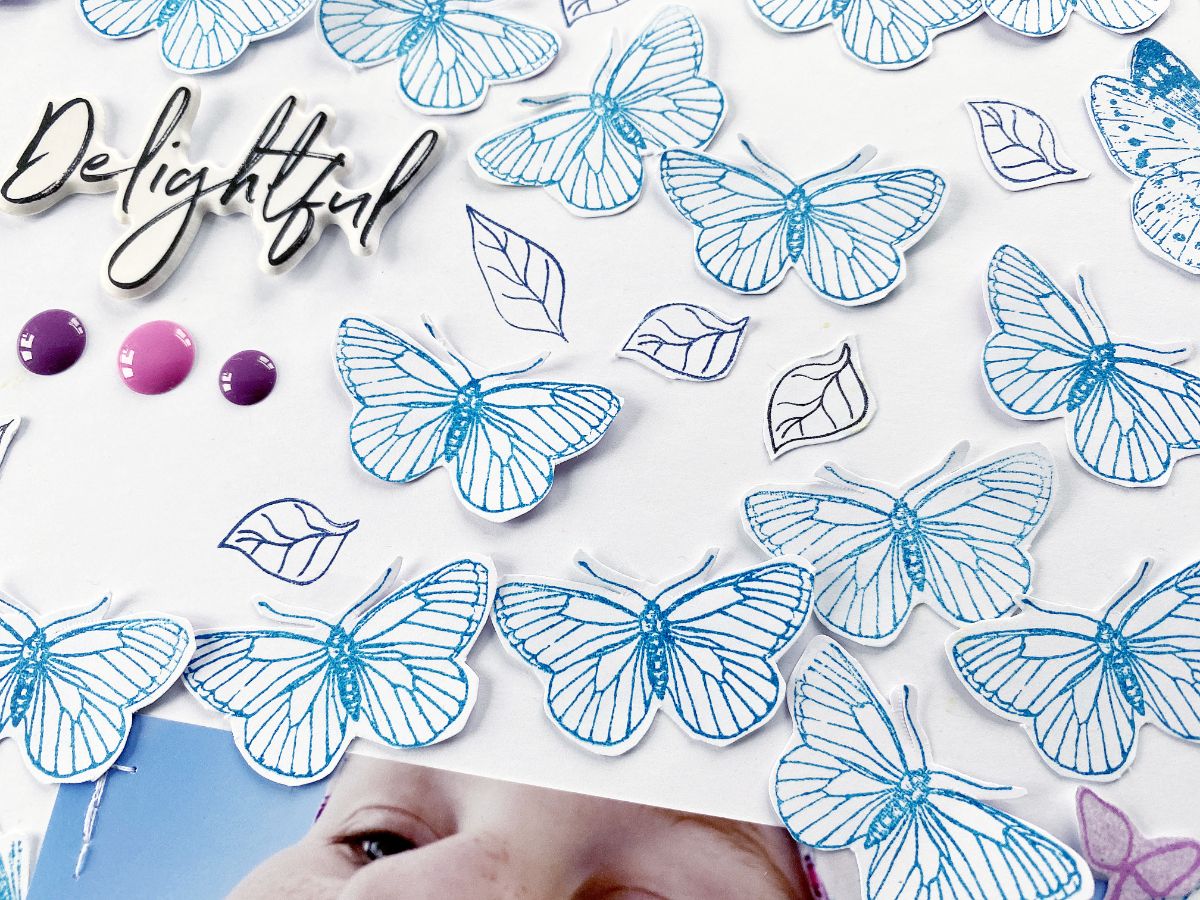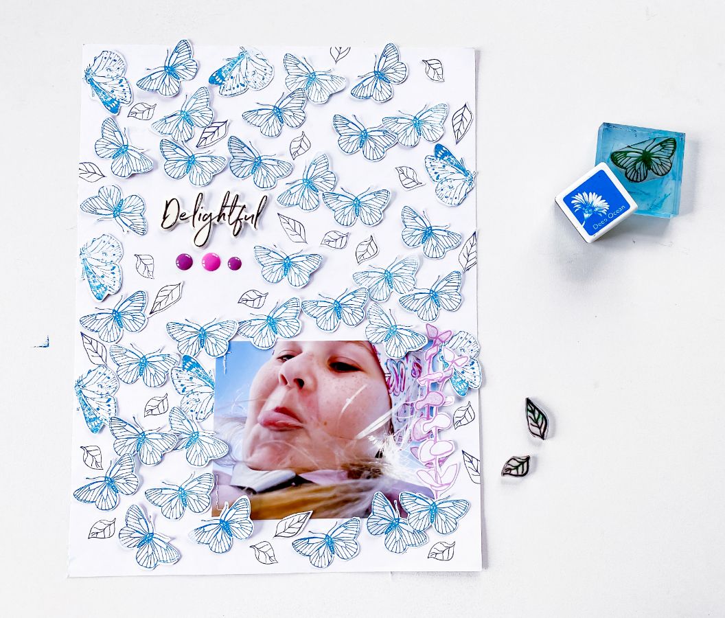 Далее без листвы бабочки показались скучноватыми и я добавила листики из набора "Анемон детальный" и в тон, к одежде на фотографии добавила «Веточку» отштампованную