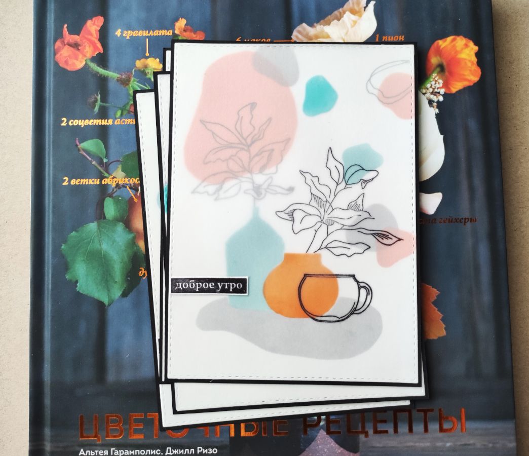 Есть у меня такая книга «Цветочные рецепты», авторы – Алтея Гарамполис и Джилл Ризо. Она часто служит мне визуальным вдохновением из-за фотографий, а также в ней можно прочитать кое-то интересное), ведь авторы рассказывают про составление красивых и стильных букетов. И вот совпали мои вдохновения - этой книгой и абстрактными интерьерными картинами, и вылилось это все в открытки с различными сосудами и растениями. А штампы ПСК с удовольствием помогли мне в этом.
