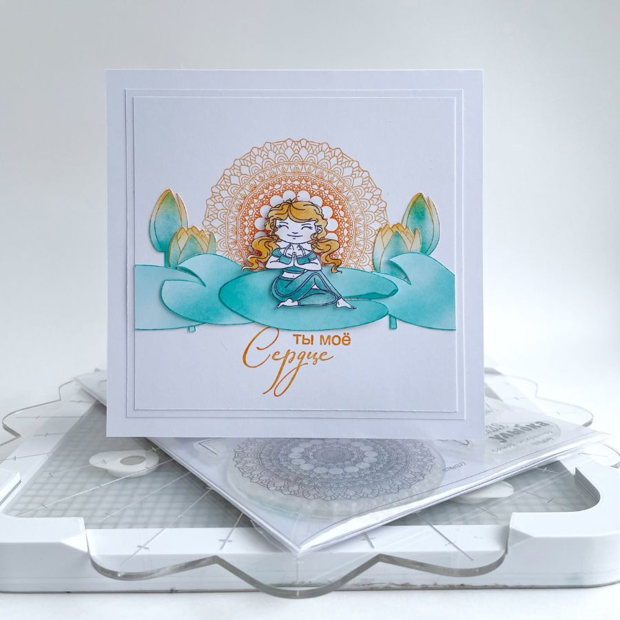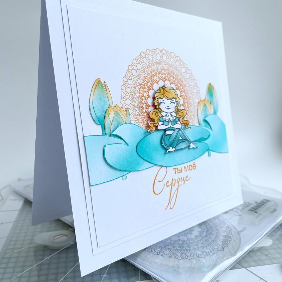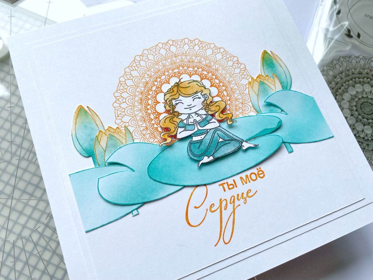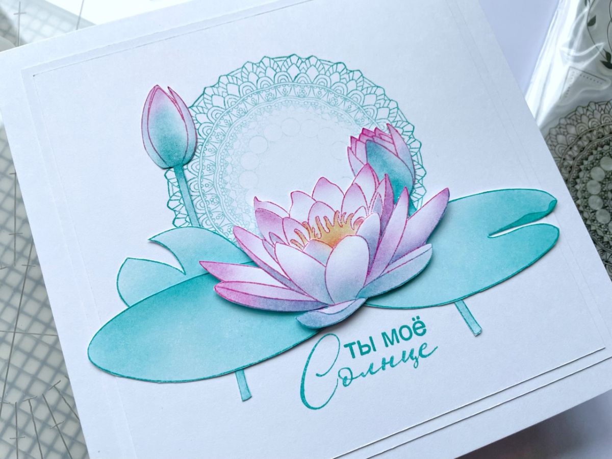 В деле штампы: Салфеточка 7.5 см, Ты моё солнце, Палас, Асана Повелителя, Кувшинки. Я люблю крупные штампы, которые вполне могут выполнять роль фонового пятна. В этой серии открыток такой акцент - оттиски штампа Салфеточка 7,5 см. Я по-разному его "раскрасила" в каждой из открыток.