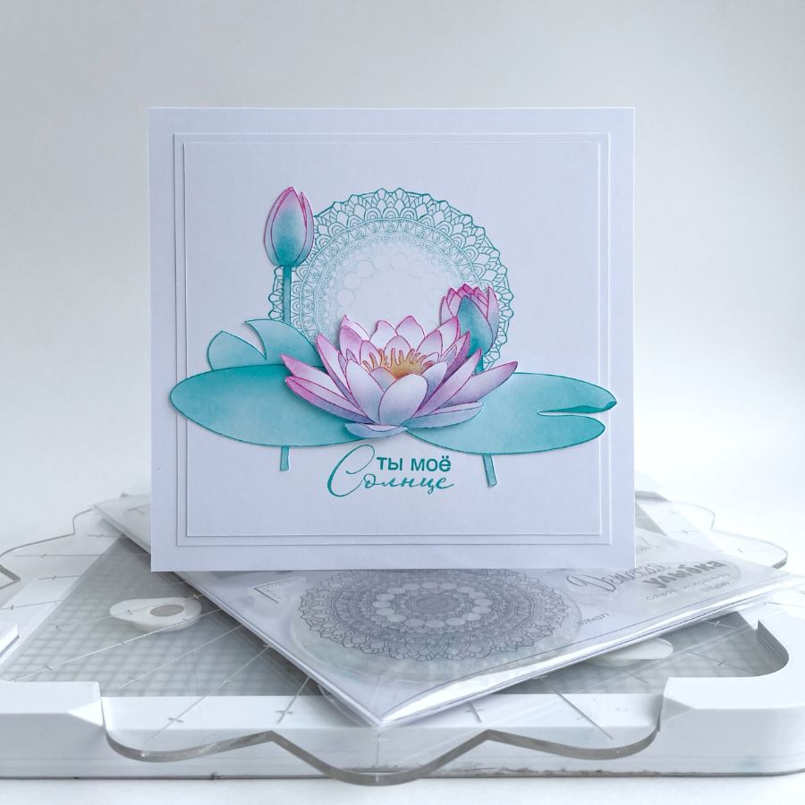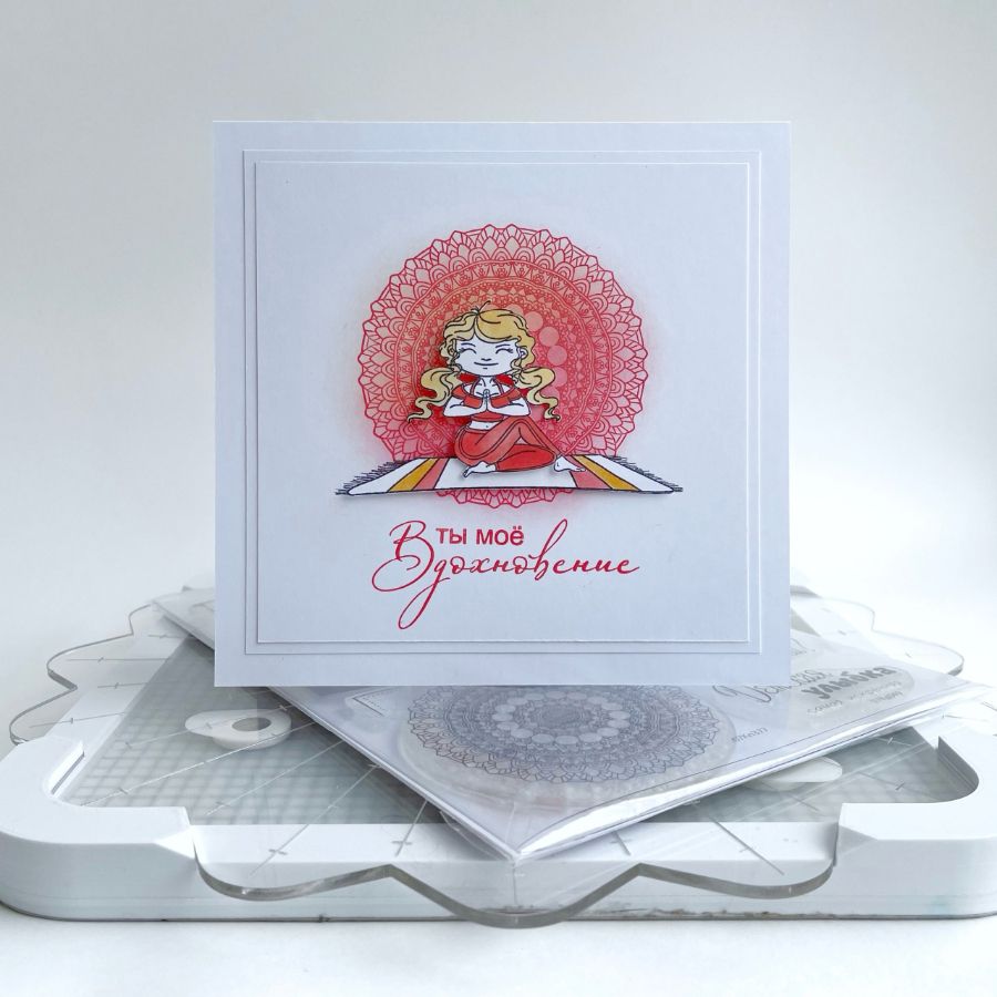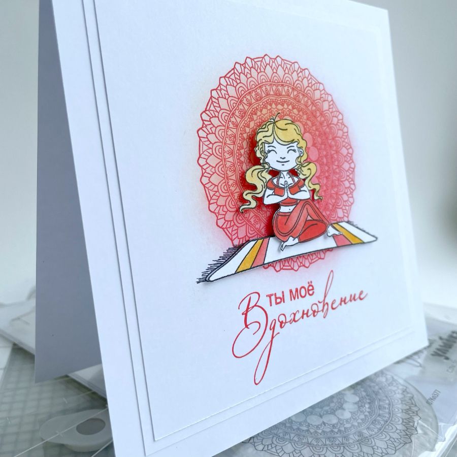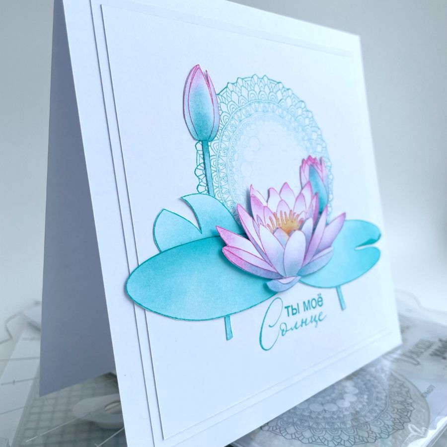 В деле штампы: Салфеточка 7.5 см, Ты моё солнце, Палас, Асана Повелителя, Кувшинки. Я люблю крупные штампы, которые вполне могут выполнять роль фонового пятна. В этой серии открыток такой акцент - оттиски штампа Салфеточка 7,5 см. Я по-разному его "раскрасила" в каждой из открыток.