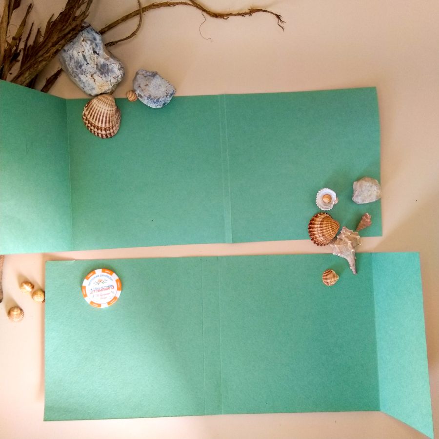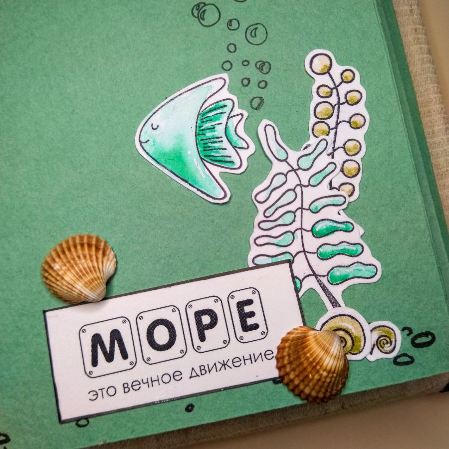 Любой альбом начинается с основы. У меня такой отправной точкой стал лист серо-бирюзового кардстока размером 59х42 см. Взяв этот красивый цвет за основу, я подобрала в компаньоны кардсток цвета слоновой кости и конечно морские штампы. Ведь альбом будет про море и желтые субмарины!