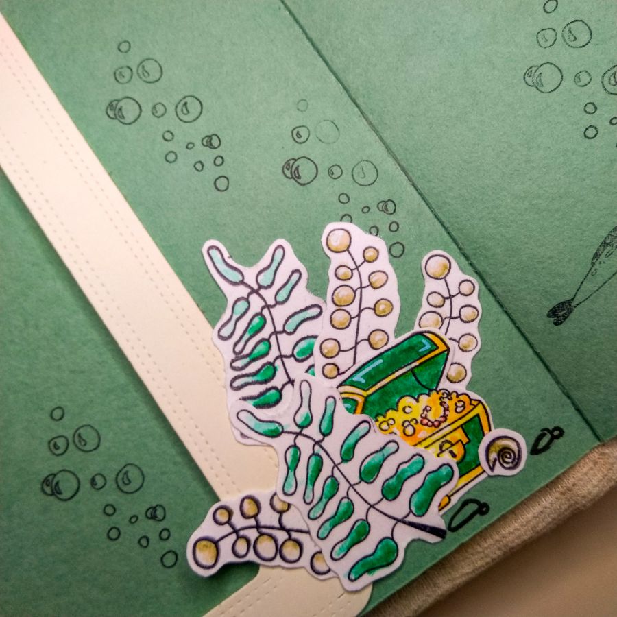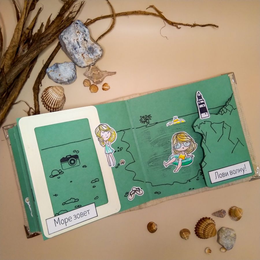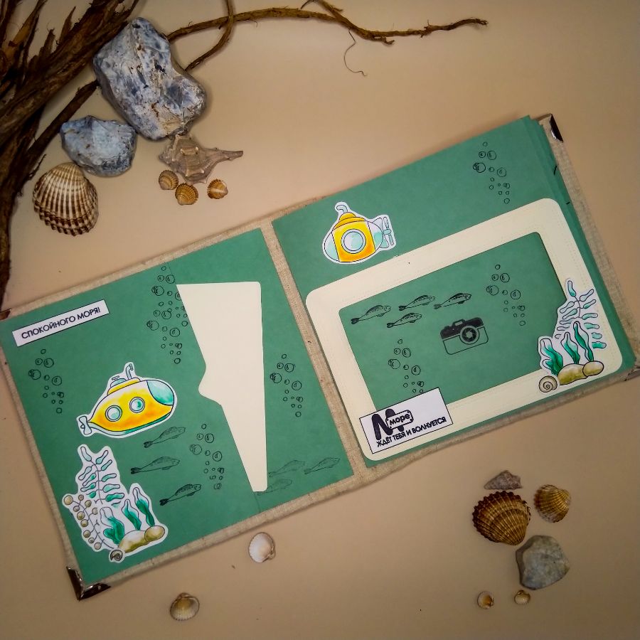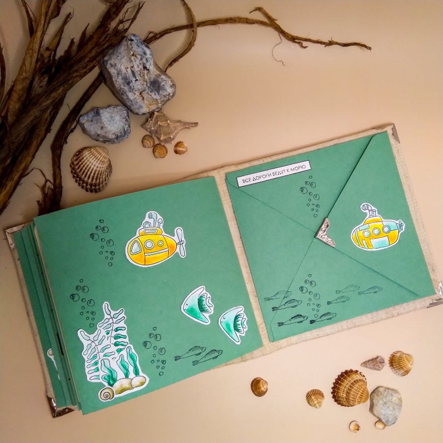 На первом развороте нас встречают сразу две ярких желтых субмарины, стая рыбок в пузырьках, и группы водорослей. Очень люблю дополнять странички надписями – они задают настроение. Здесь пожелание «Спокойного моря» и напоминание, что «Море ждет тебя и волнуется».