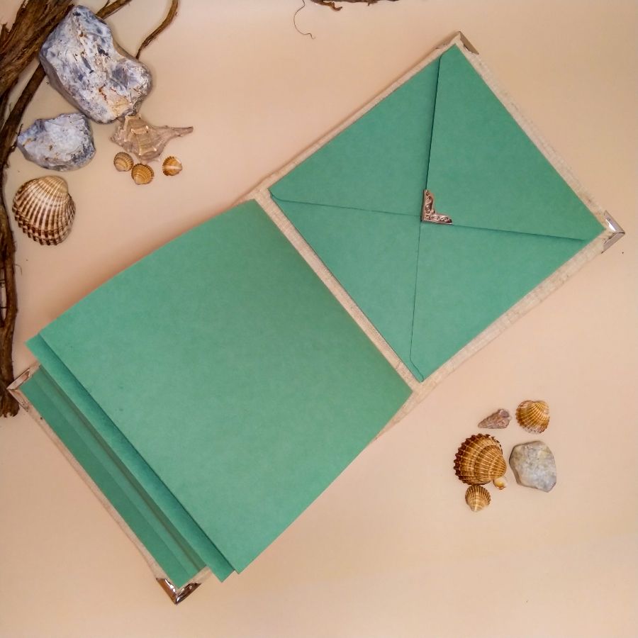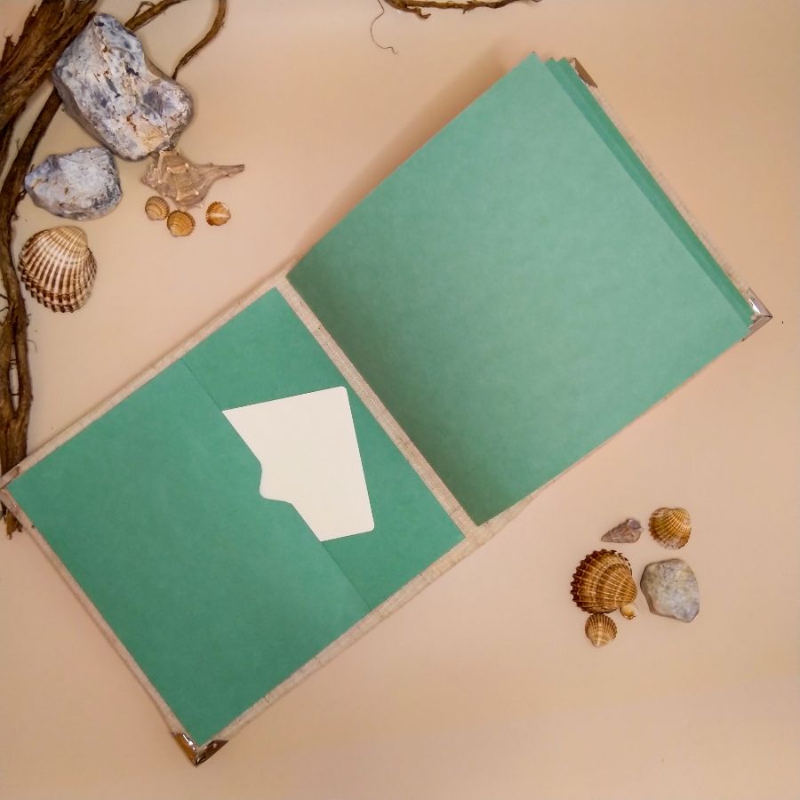 На форзацы делаю карман и большой конверт, в который удобно сложить карты, билеты и прочую памятную бумажную мелочевку из отпуска. Хлястик конверта закрывается на магнит.