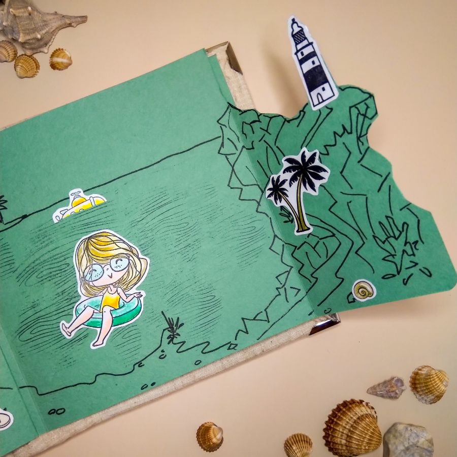 На четвертом развороте пляж, ракушки и девушки отдыхающие каждая в свое удовольствие. «Открывашка» сделана в форме скалы с маяком. Пальма и сланцы из набора «Море, пляж 2». На горизонте мы видим все ту же желтую субмарину.