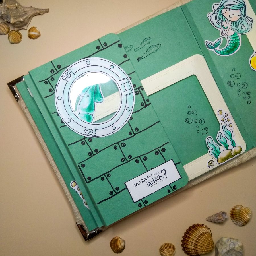 Третий разворот с «открывашкой» и окошком в виде люка, в который заглядывает кальмар. Тут же стоит глазки малютке-батискафу русалочка и плавают рыбки. Предложение «Заляжем на дно?» звучит как приглашение.