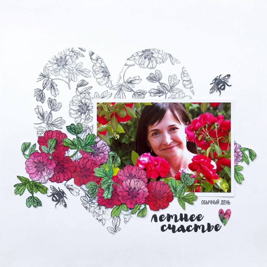 Фон через самодельный трафарет - прием простой и эффектный, и сразу так не остановишься. Вот я и решила сделать еще страничку, используя другой любимый штамп - ДРЕВОВИДНЫЙ ПИОН. В этой работе фон состоит только из его оттисков. Впрочем, как и декор. Традиционные ШМЕЛИ привносят динамику. СЕРДЕЧКО - милый акцент. Штамп "обычный день" из набора СЕМЕЙНЫЕ НАДПИСИ - маленькая, но каркасная деталь: среди обилия сложных рисунков, прямые линии гротескного шрифта успокаивают взгляд и поддерживают прямоугольник фотографии.