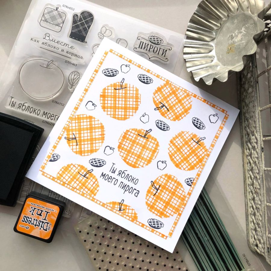 А прием с "раскрашиванием" через трафарет я использовала для фона другой открытки. Для более плотного заполнения фона мне нужен был мелкий штамп, желательно с заливкой. Такого у меня нет, но есть штамп ПИРОГИ с идеальным фрагментом - сделала для него трафарет-маску. Веточки яблока отштампованы таким же образом.
