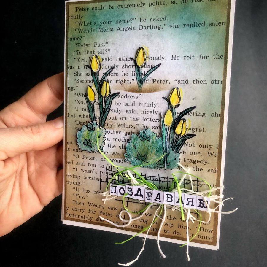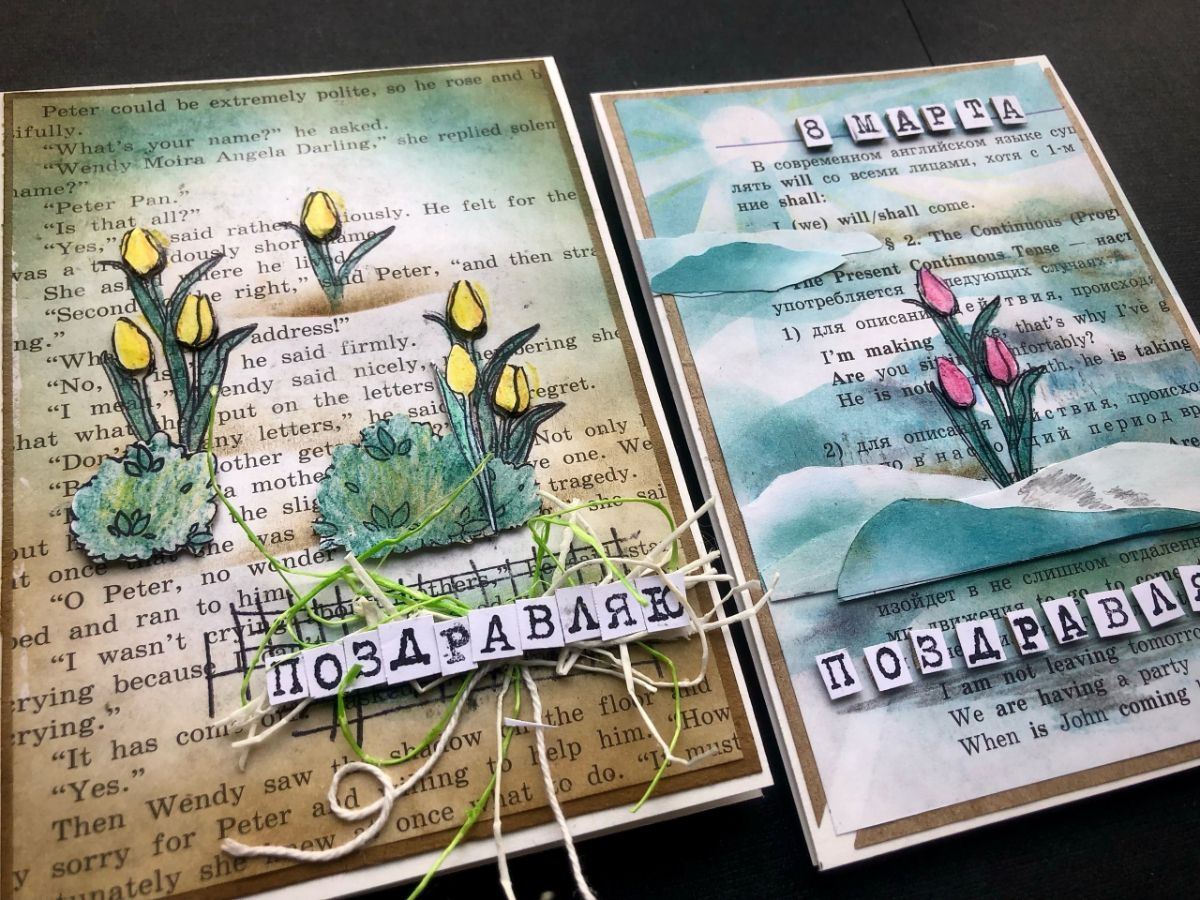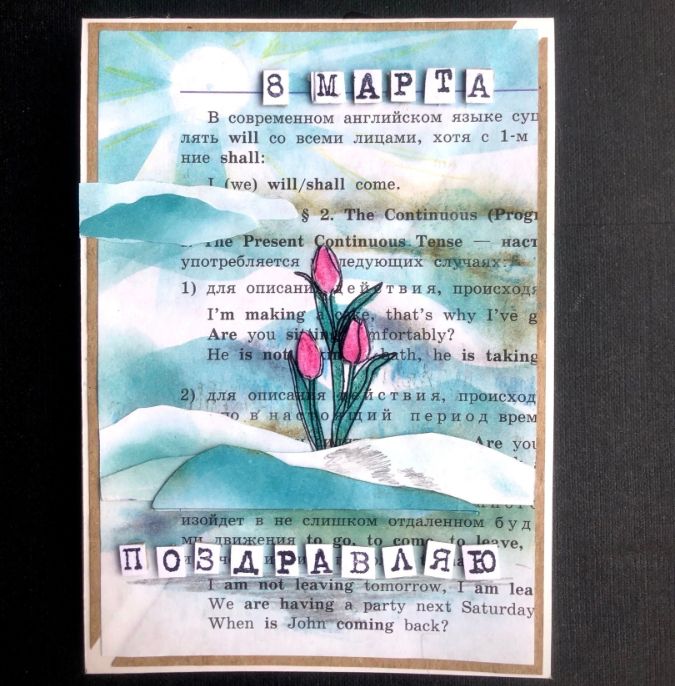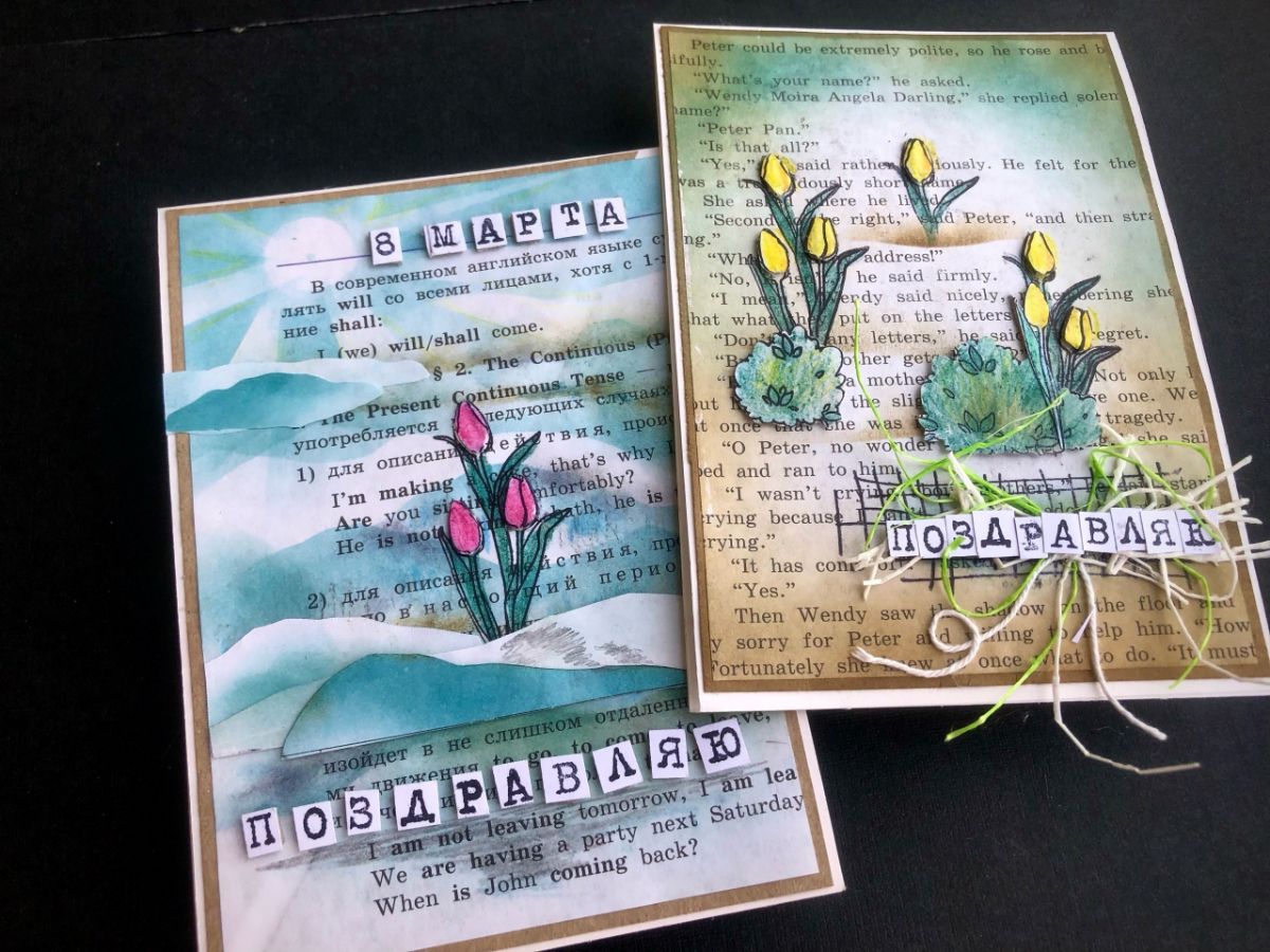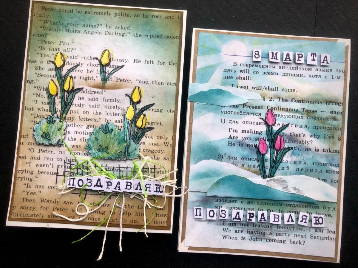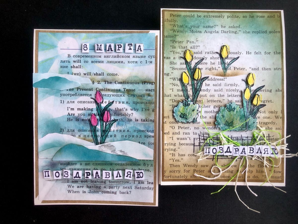 На открытках к 8 марта у меня распустились тюльпаны в разных погодных условиях. На одной уже греет первое весеннее солнышко, а на другой цветам пришлось пробиваться сквозь сугробы снега. Фоном мне послужили книжные страницы, затонированные дистресс чернилами.