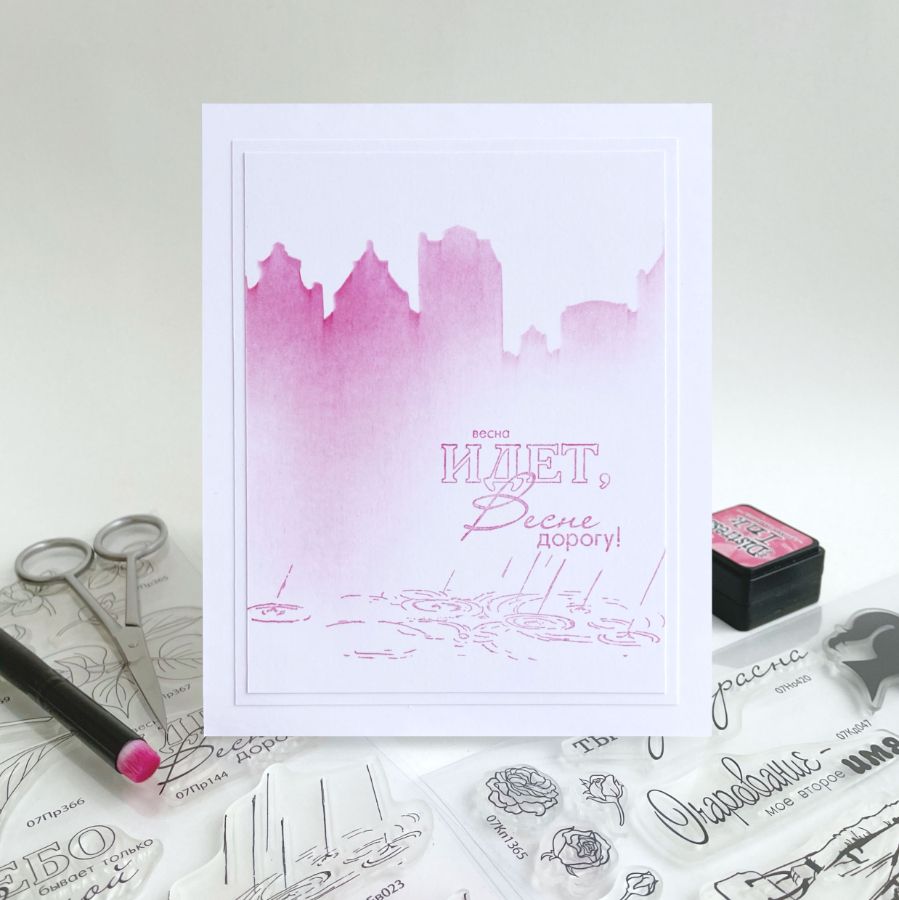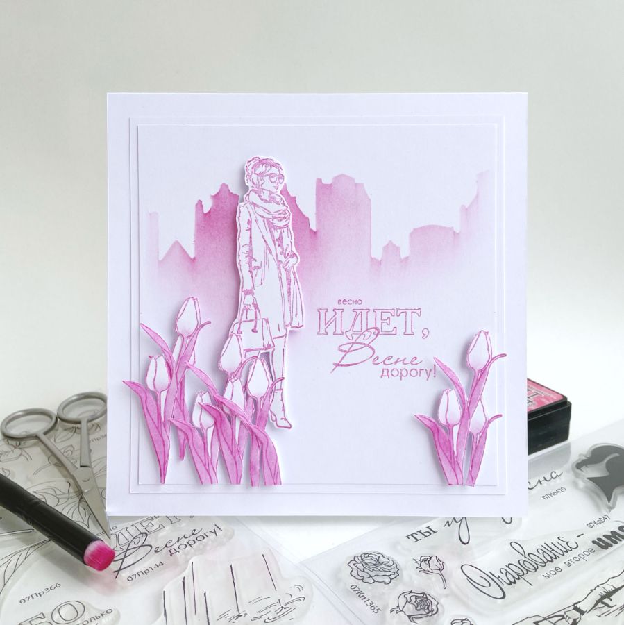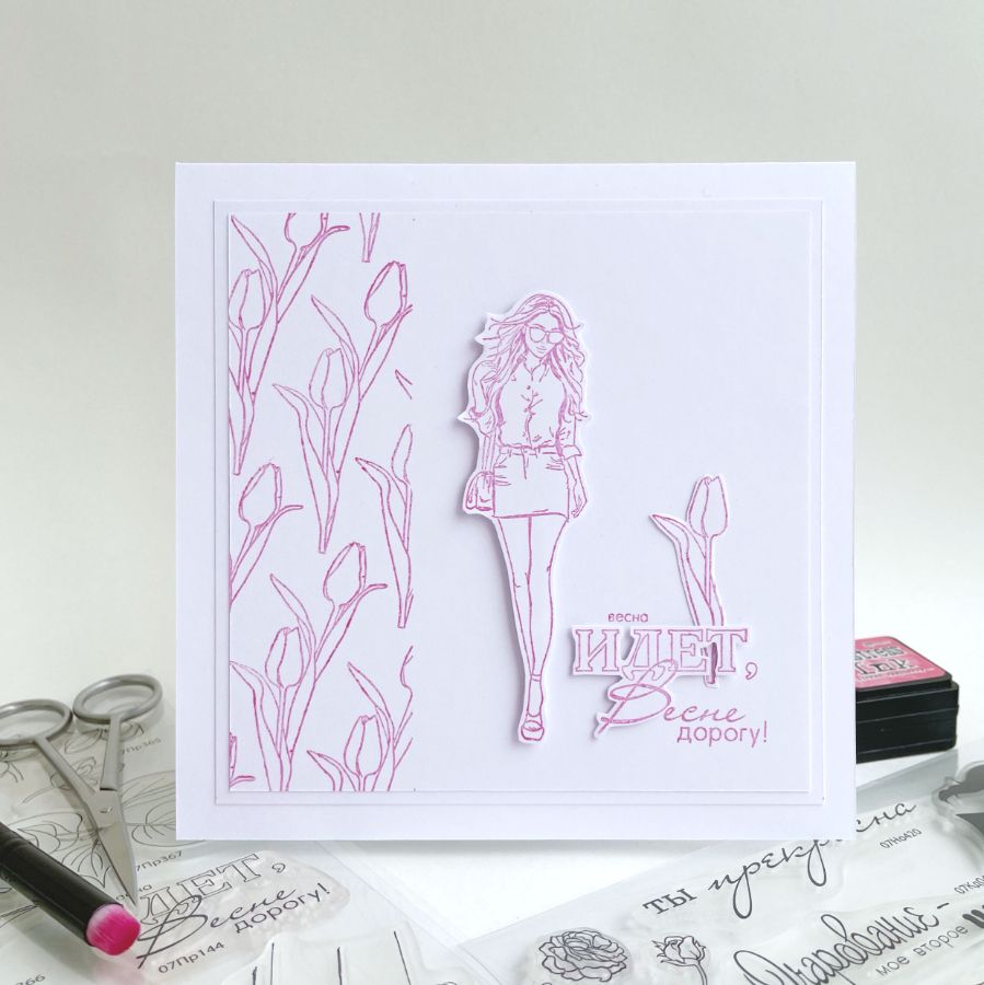 Начнём с минимализма. В первой открытке нет раскрашенных оттисков. Оттиски предстают в своем первозданном виде. Фон в открытке простой. Небольшая фоновая панель служит своеобразной частью пейзажа, похожей на клумбу. Стиль фоновых оттисков, рисунка модели и стиль надписи хорошо сочетаются друг с другом.