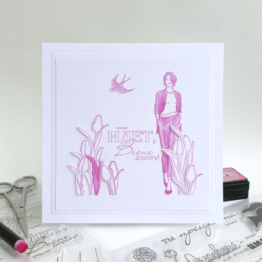 В деле штампы: ДЕВУШКА В МИНИ, ДЕВУШКА С СУМКОЙ, ДЕЛОВАЯ ШТУЧКА, БУКЕТ ТЮЛЬПАНОВ, ВЕСНА ИДЕТ, ЛАСТОЧКА МАЛЕНЬКАЯ, ДОЖДЕВЫЕ ЛУЖИ, БУТОНЫ РОЗ, С 8 МАРТА и трафарет с силуэтами домов.