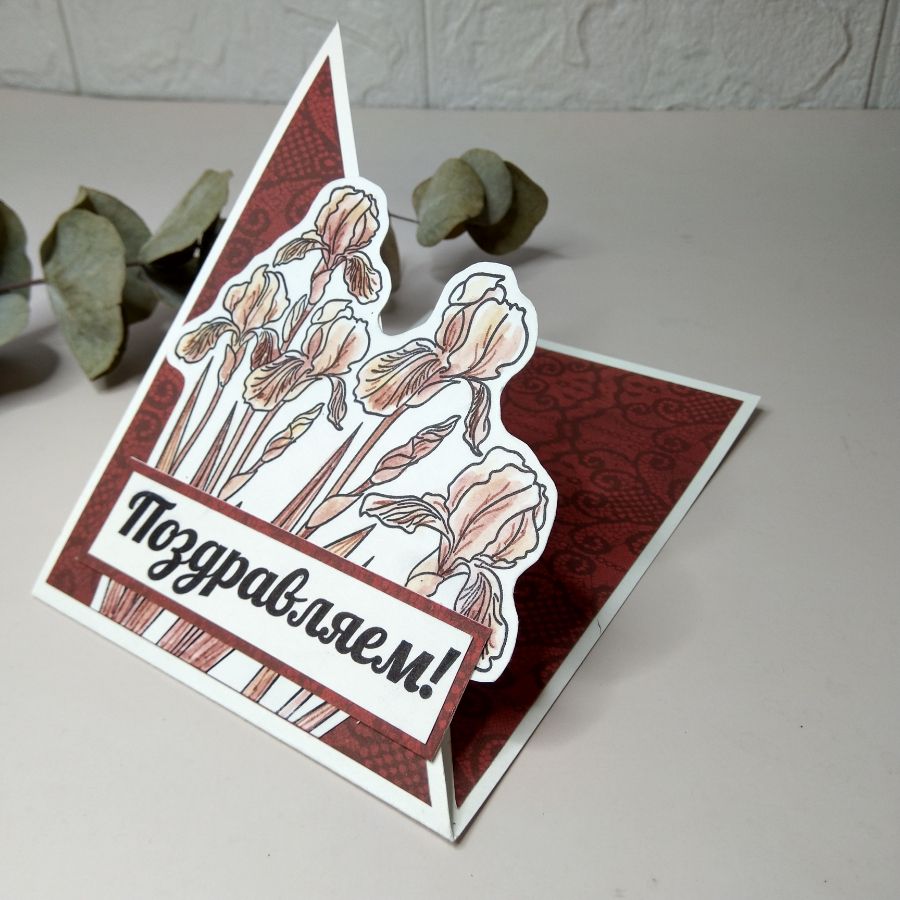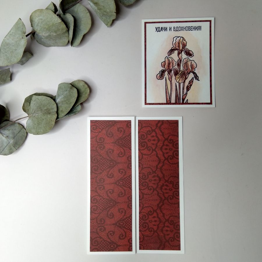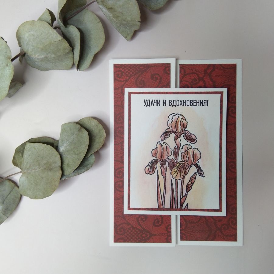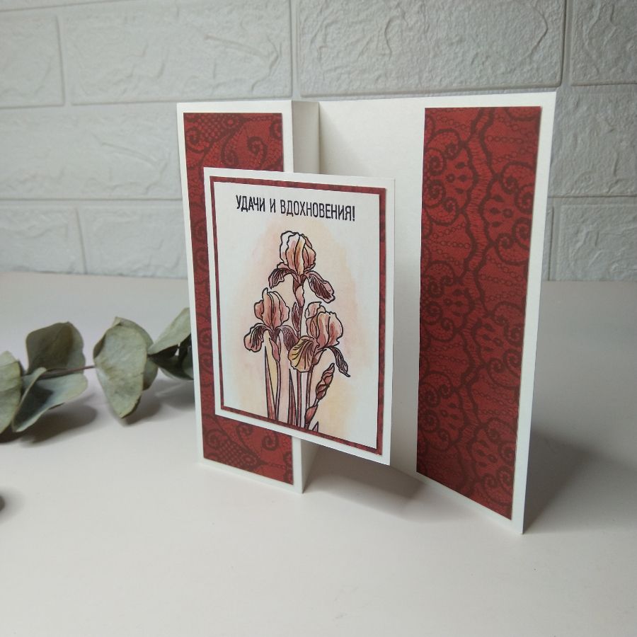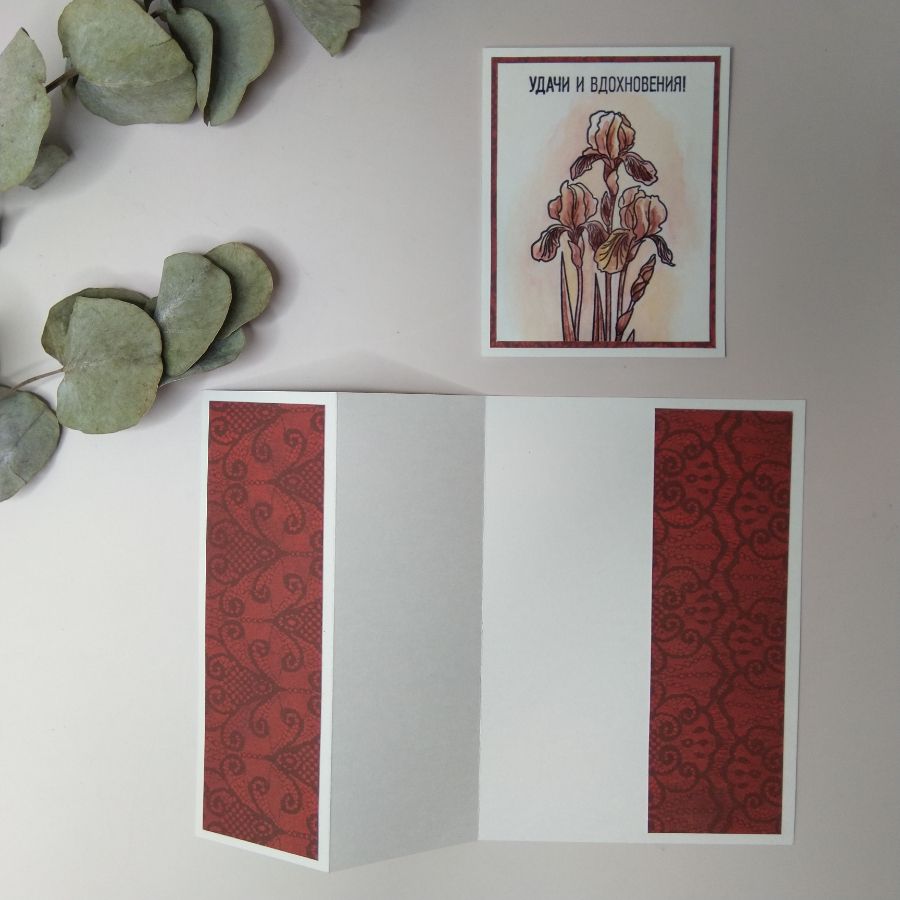 А вот так открытка смотрится, когда к передней панели приклеили декоративную панель с ирисами и надписью «Удачи и вдохновения!».