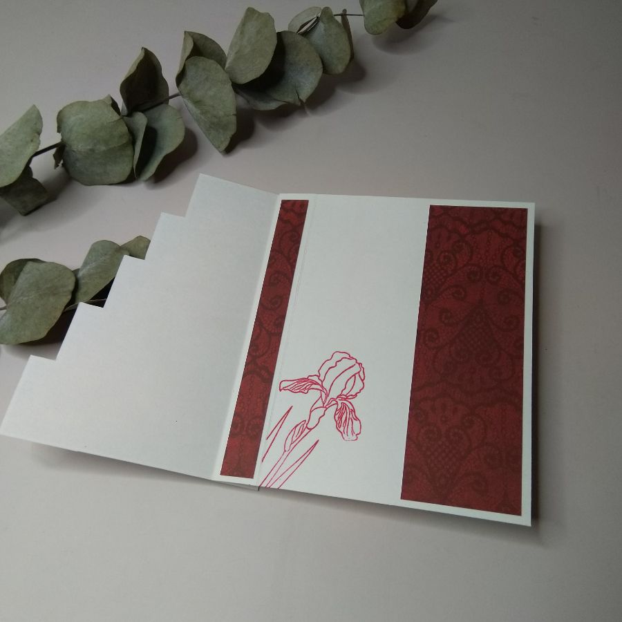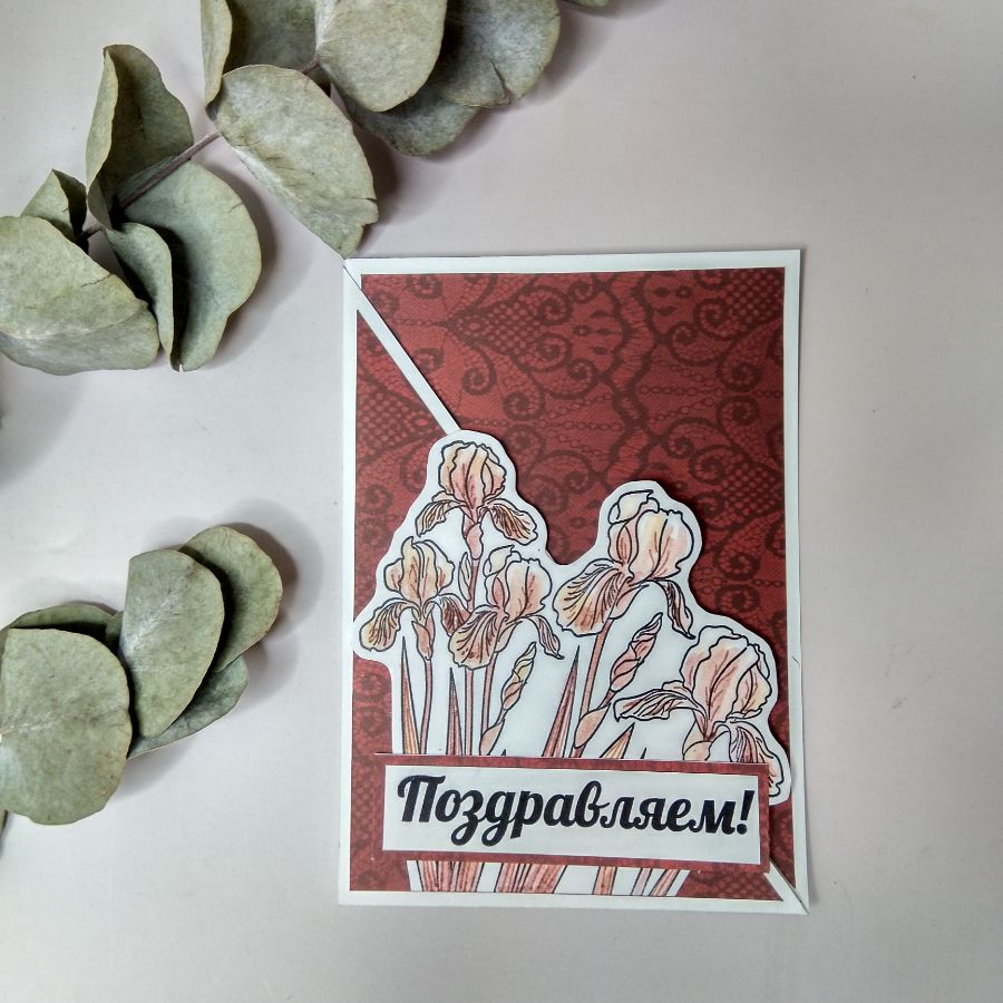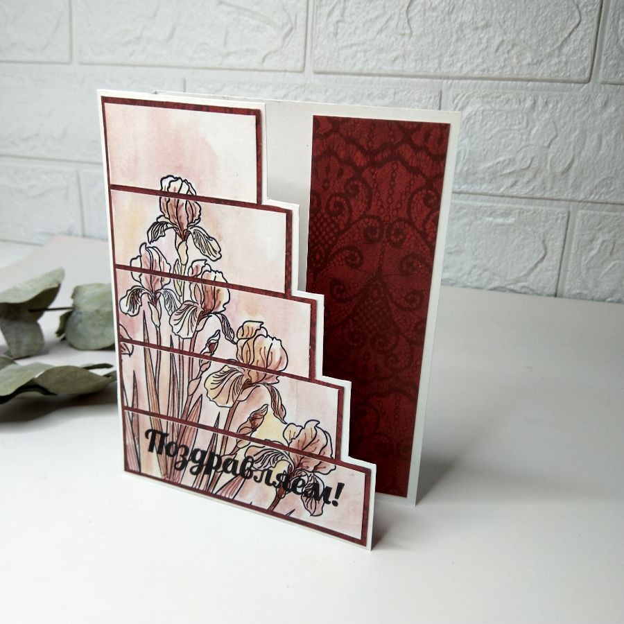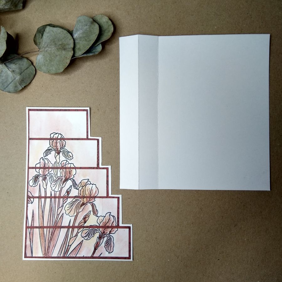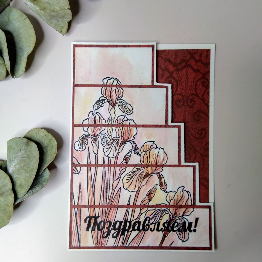 А вот так открытка смотрится, когда к передней панели приклеили декоративную панель с ирисами и надписью «Удачи и вдохновения!».