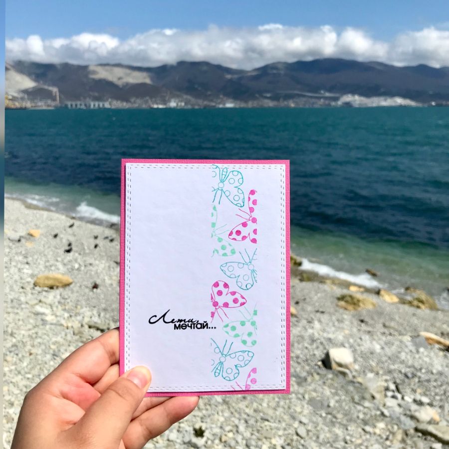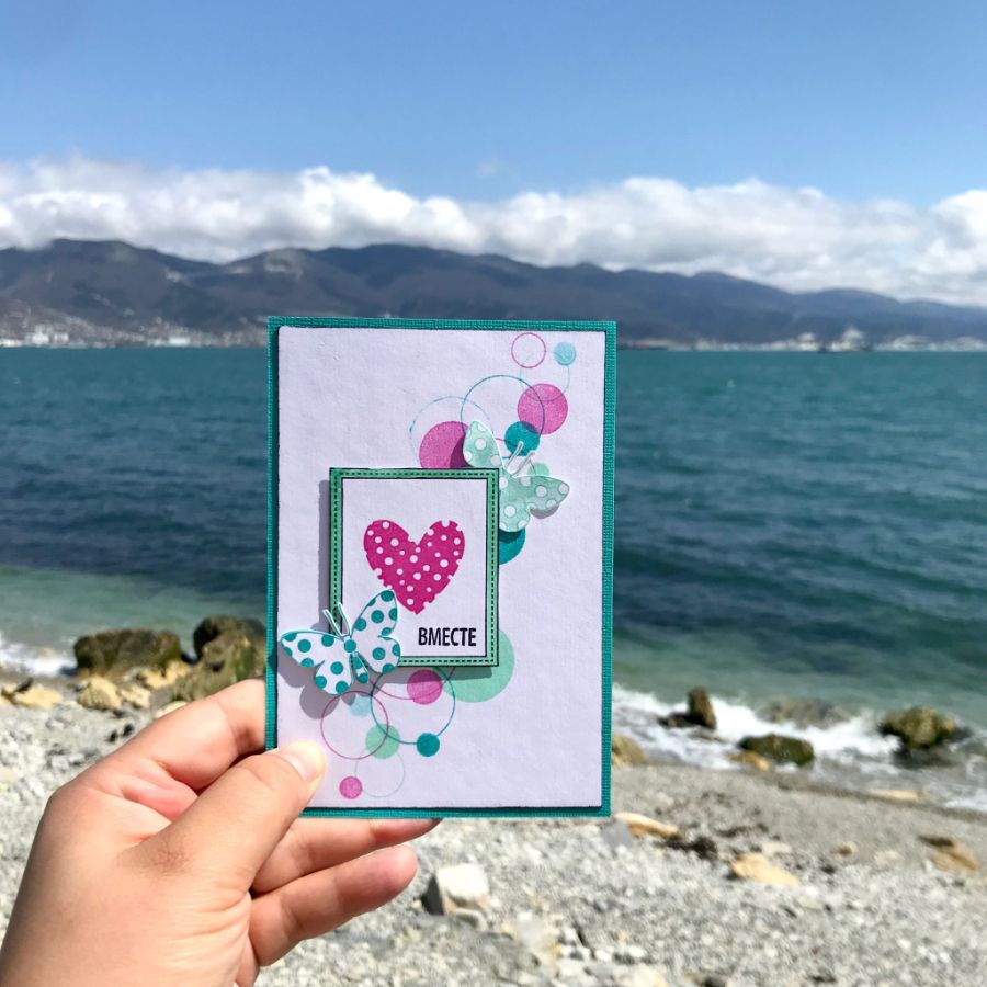 Я пожелала переехать с семьёй в свой дом, в тепло, к морю, к горам. И сегодня моя мечта в полушаге от меня - дом будет готов через полгода. Ощущаю, как мечта становится реальностью. И скоро я смогу пойти после работы к морю бросать камушки, считая круги на воде. В предвкушении этого занятия, фон на открытке я решила сделать с помощью штампов Круги на воде легкие и Круги на воде глубокие. Надпись из Весеннего набора и вся моя любовь в штампике Сердце в точечку большое. Получилась такая бабочково-морская любовь.