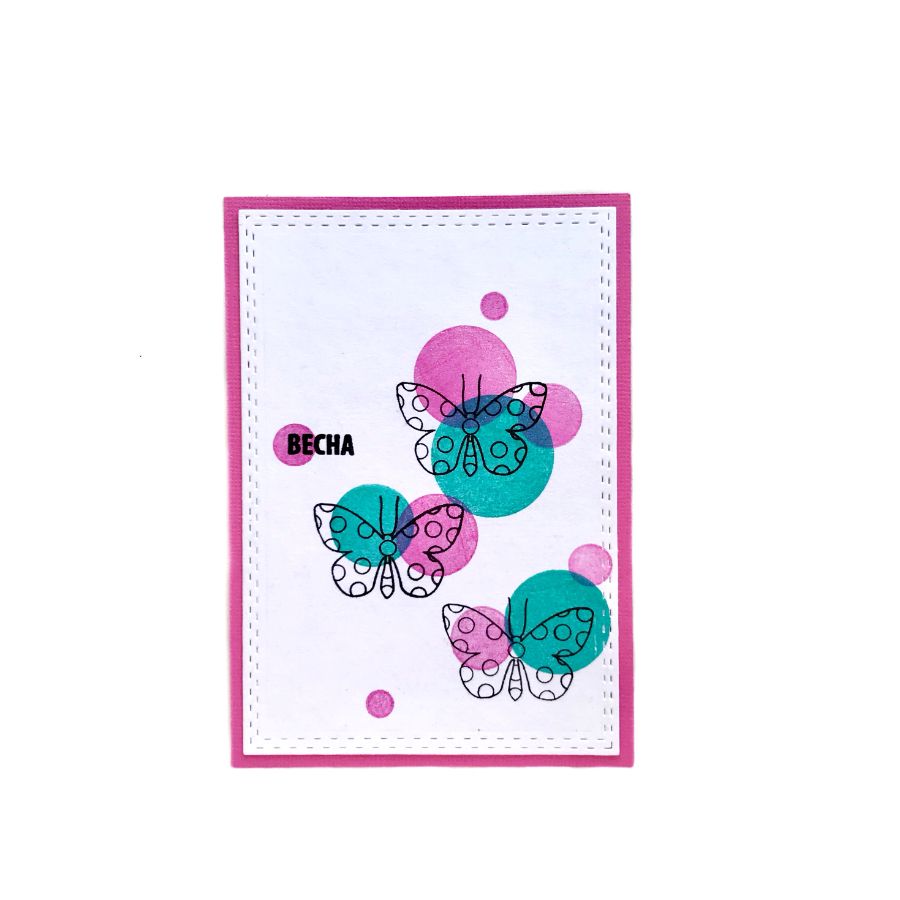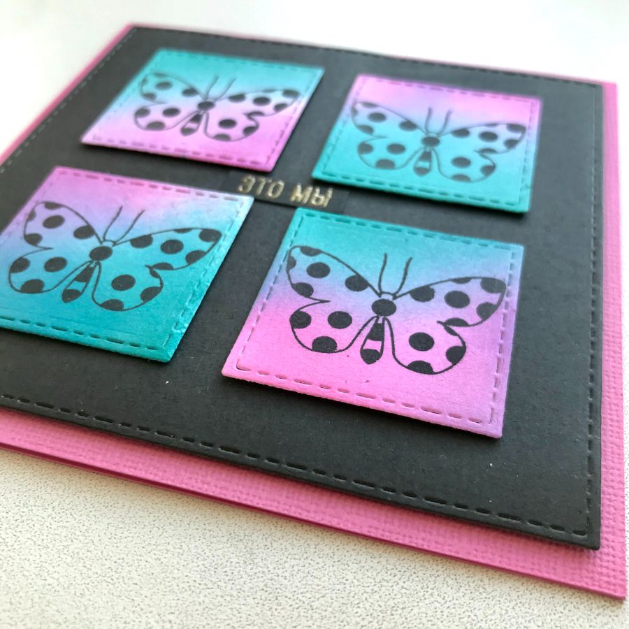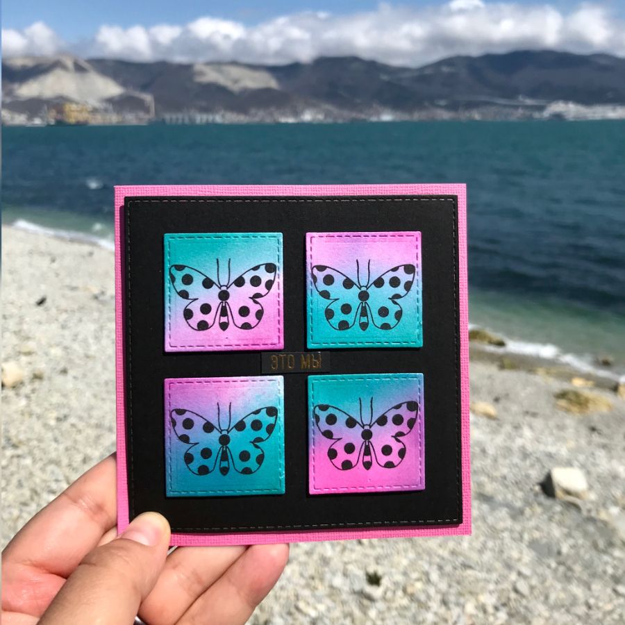 Пусть эти бабочки вдохновят вас на мечты, желания и перемены! Трансформация любой сложности возможна! Уж бабочки то знают. На следующей открыке мне снова пришли на помощь штампы Круги на воде глубокие и такие простые, но важные надписи из набора: Вместе, Ты и Я.