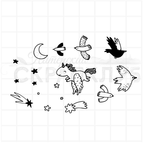 Прозрачный фотополимерный штамп для скрапбукинга. 11 штамов в наборе. Размер большего штампа 2.5х2 см